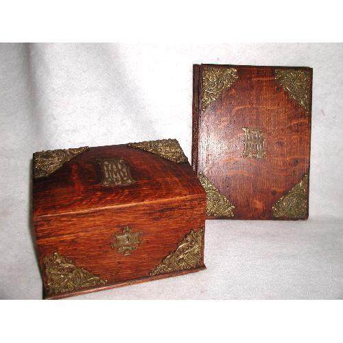 Wonderful two piece 19th century English desk set consists of an oak slant front letter or stationary file with brass corner mounts and decorative center as well as brass escutcheon with lock,no key. The lid is lined in deep blue silk,the six slots as well as the ink well,covered in handsome blue and cream paper. The original tag remains by Carlisle & Watts Stationers and Manufacturers 49 Hanover St. Edinburgh. The other piece is an oak blotter on one side and an expandable document file on the other. Made of leather with an oak front,same brass mounts and leather back and spine. Minor wear to the leather particularly at spine. Lined with the same cream and blue paper,green blotter beneath the name and address marking this piece as well. For use at the desk or to carry as attache. Other than leather at spine,both in wonderful condition. Box measures 6.5H X 9L X 5.75D. Blotter measures 8.75H X 11.5L X 5/8 D. Additonal photos available.