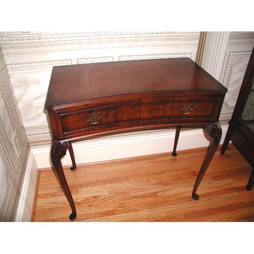 Lovely little walnut burl table from England C.1900 with concave front and heavy carving on the knees of the high delicate legs. One drawer with original brass hardware. The burl is booked and matched on top and front. Beautiful coloring,very rich. Mitered 2 front corners. Finished on the back so that it can be used out in a room,coupling with the size,great for a small desk,vanity or foyer table. Ample room for knees under the drawer. Excellent condition. Measures 29H X 16.5D X 29.5L.
