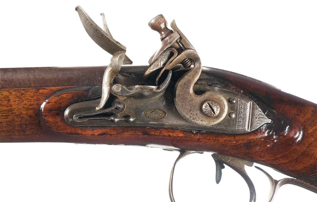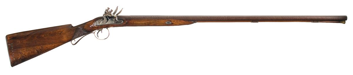 Damascus barrels with a low blade front sight on the solid rib. Lightly engraved lock plates, trigger guard, and upper tang. There are no maker markings, but consignor states that the shotgun is English, circa 1790. Gold inlaid bands and once polished ovals (once had the makers marks which are now gone, having been removed) adorn the breech. Half length stock with checkered wrist and shotgun style buttplate. The right side of the buttstock is stamped "DN14055". Complete with a brass tipped wooden ramrod.