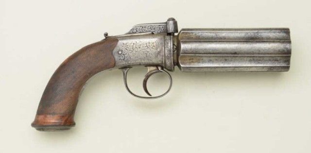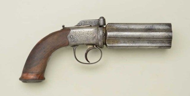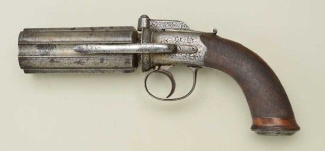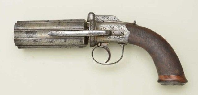 English Dragoon size pepperbox marked on top of hammer “J.W.Edge Manchester” circa about 1850. The pepperbox measures 11-5/8” overall with nearly 5” barrel cluster showing 5 shots of 54 caliber smooth bore. The DApepperbox shows a nicely scroll engraved frame and mounts with finely checkered wood stock. There is a belt hook attached to left side of frame. Metal surfaces show some light to moderate pitting and erosion. Theengraving is crisp; the stocks are good to very good with slight wear to the checkering. The action is working. One of the biggest English pepperboxes we have seen. From an old N.Y. collector’s estate.Est.;$1,250-$2,500.