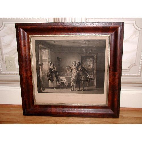 Gorgeous thick old walnut burl frame with silver liner frames this C.1850 English engraving. Titled "Anne Page Slender And Shallow" "A scene from the Merry Wives of Windsor Engraving From the Original Picture in the Collection of Phillip Hone Esq. American Art Union 1850". Beautiful attire on the subjects,note the shoes and ceiling. Frame is walnut burl thick veneer over walnut and tiny pieces of veneer are missing in just a few spots,however the under layer is the same tone so does not show without close examination. See photo of corner frame. With the age of this piece it is backed with wood slats and the center section is missing which has allowed something to puncture the engraving in one tiny area,see photo,otherwise in excellent condition. The subject matter and work on the engraving is fabulous Measures 30L X 28H X 1.25D.Name of the engraver,etc. on bottom of picture.