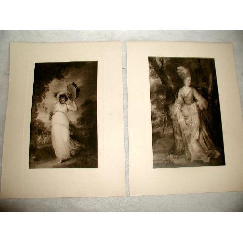 19th century pair of beautiful engravings very detailed and both from famous paintings of the 18th century. "The Girl With The Tambourine" comes from England and is from Mr. Alfred A. De Pass's Collection. The artist was John Hoppner,chorister in the Royal Chapel at Windsor,fashionable portrait painter and a favorite of George III who paid for his art instruction. The young girl in the engraving is full of merriment and dressed in a beautiful gown. Light hearted and happy. The other is Mrs. Robinson,mistress of the Prince of Wales painted by Gainsborough and part of the Wallace Collection. She published a number of poems,plays and tales during her short life. Separate sheet of history and documention on both.Excellent condition. Antique cream background. Measure 20H X 15W.