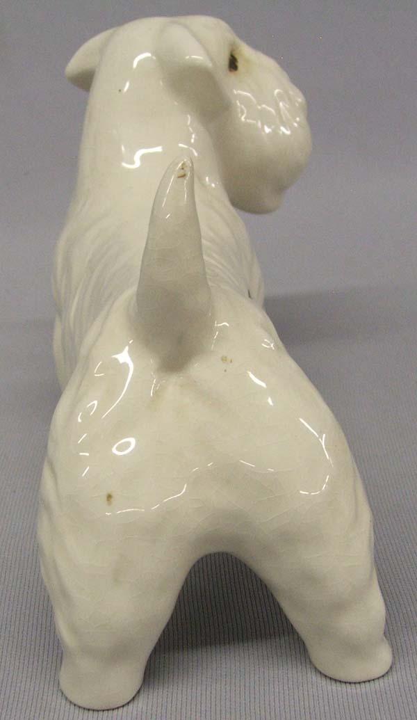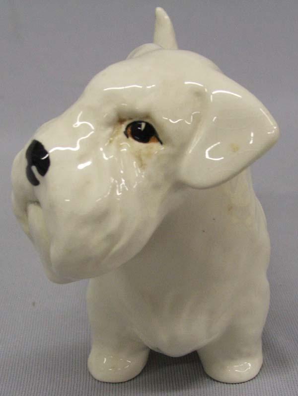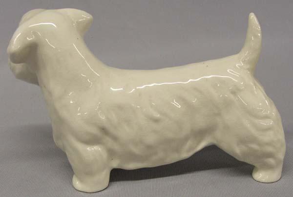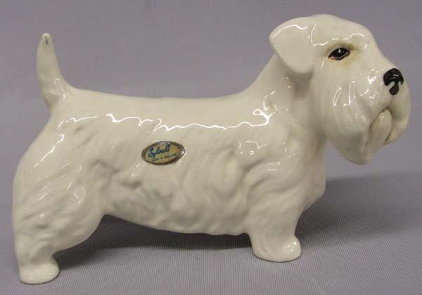 English Fine Porcelain Sealyham Terrier Figurine By Sylvia C, Made In England. Measures approx. 5''H x 7 1/2''L x 3''W. SHI $20.