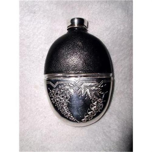 English 19th century flask in excellent condition. No scratches in silver or wear to leather. Either used infrequently or not at all. Silver plated screw on cap with inner seal and cork center,removable lower half with handsome engraving on both sides which serves as the drinking vessel. The flask itself is glass with the top half covered in black pebble grained leather. Oval shaped and flat to fit into a breast pocket. Measures 5.5H X 3.5L X 1D.