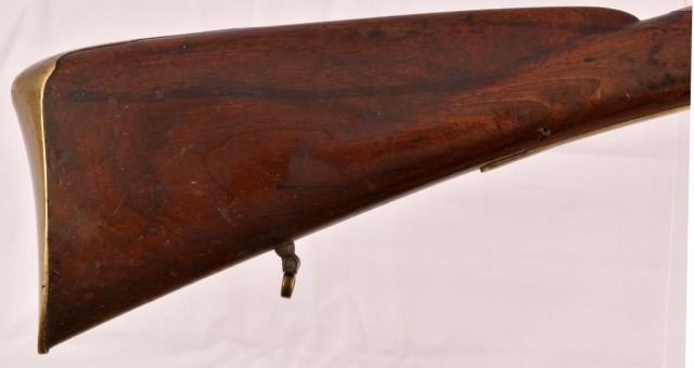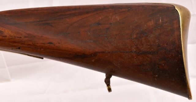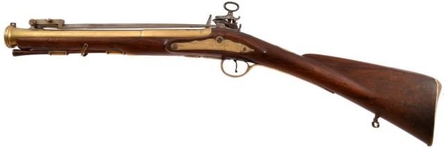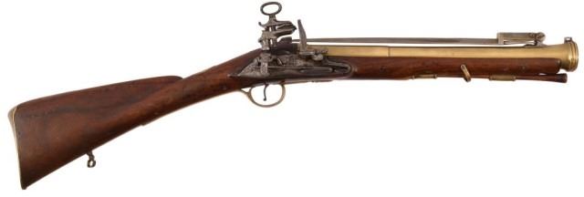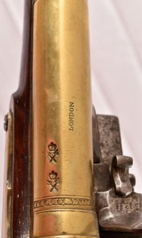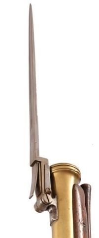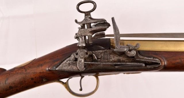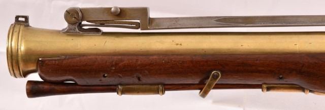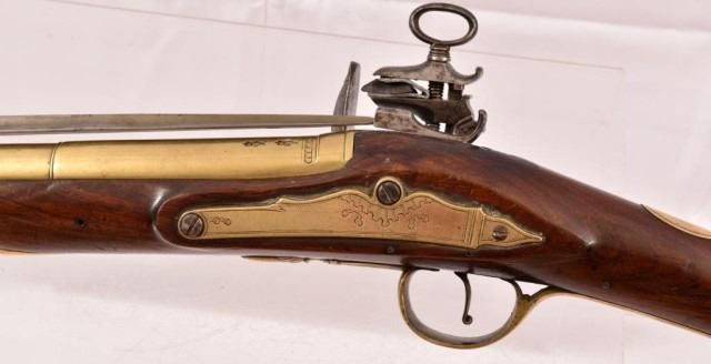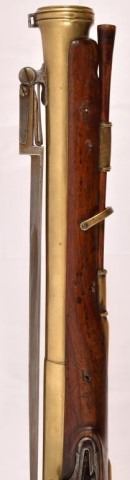 14.5" brass barrel with bayonet. Circa 1740, has "R.Y.L." on underside of stock. Marked London on barrel, the lock is a Miguelet by Gennard Scarafone