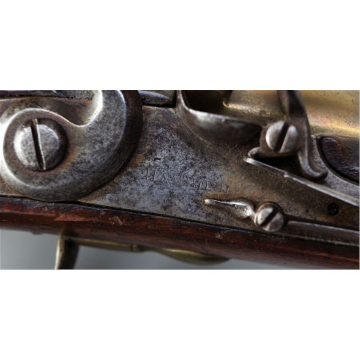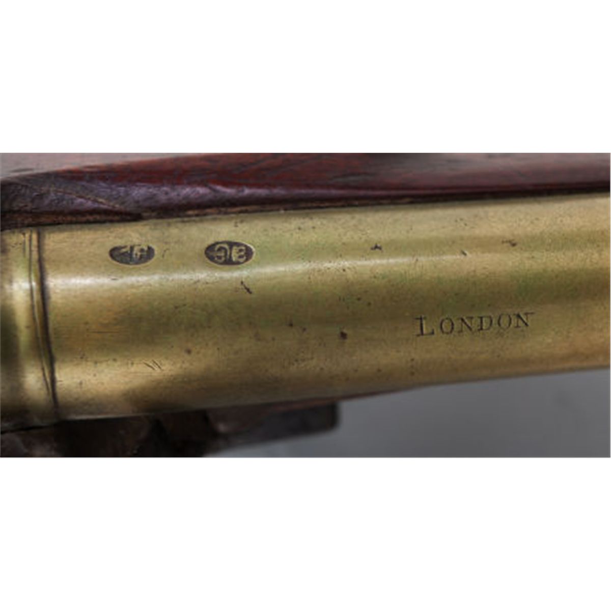 English Flintlock Blunderbuss by Hammond. 1 1/4-inch muzzle bore. 14 1/2-inch brass barrel with flared muzzle and banded breech. Top of barrel marked: London. English proofs at breech. Lock marked: Hammond. Brass furniture. Walnut stock. Wooden ramrod with brass tip. Length: 30-inches overall. Condition: Good. Metal with light age patina. Lockplate with light pitting and wear. Wood with light wear and blemishes. Minor splice repair at end of left side of fore-end. Tiny chip in front of lock. Small at hairline cracks at breech and back of tang.