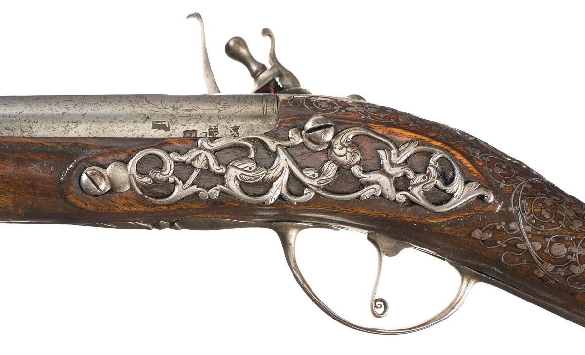 Condition: Good, with light scattered pitting and dings on the period cleaned and polished barrel, showing a few areas of brown patina on the bright gray metal. Proofs are faint on left side of breech. Stock is good as period repaired, with a few mended cracks and minor chips and cracks. The silver wire is very fine, with a few dark sections. Mechanically very good.