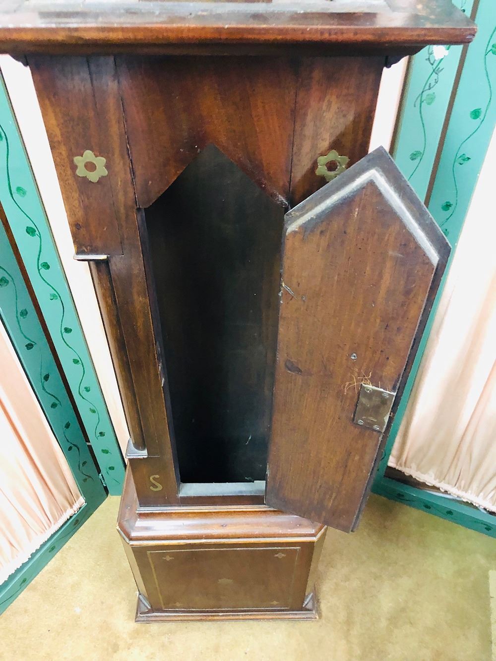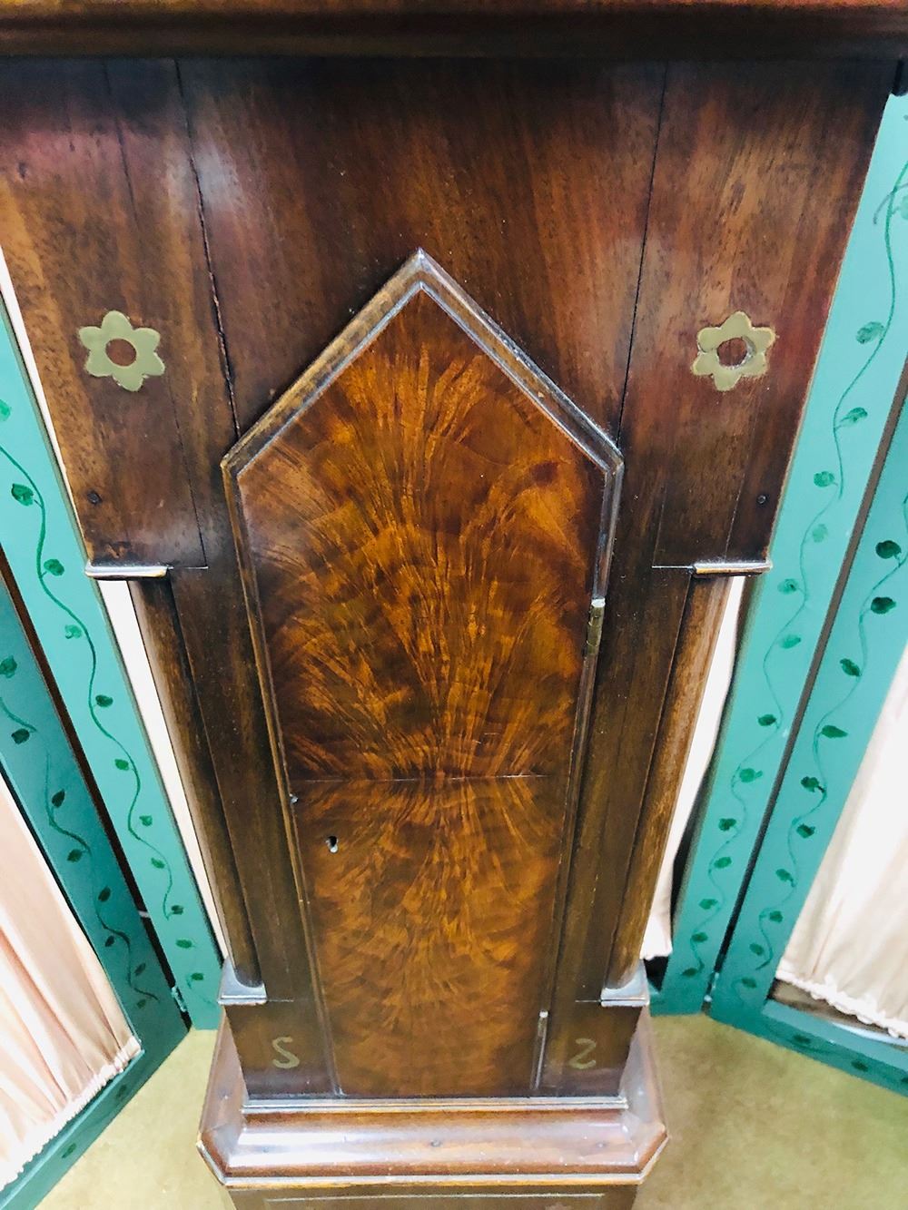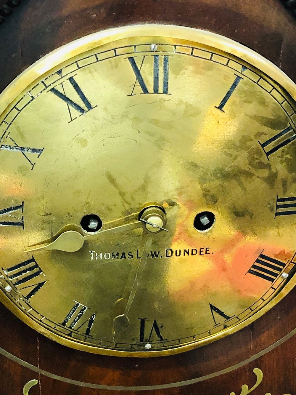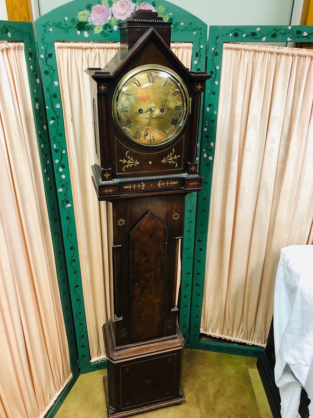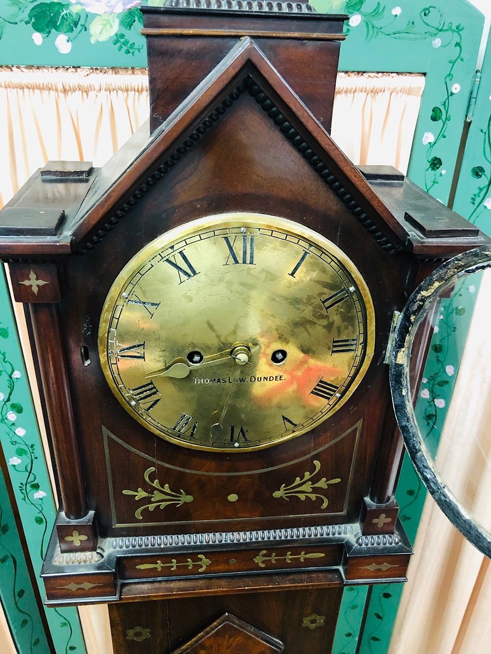 Beautiful English Grandmother clock by Thomas Low. Dundee with fusee movement. Beautiful inlay, burl on front, steeple top. Measures approx. 62" tall x 13.25" wide x 9.75" deep.