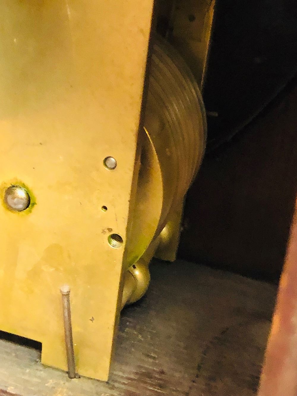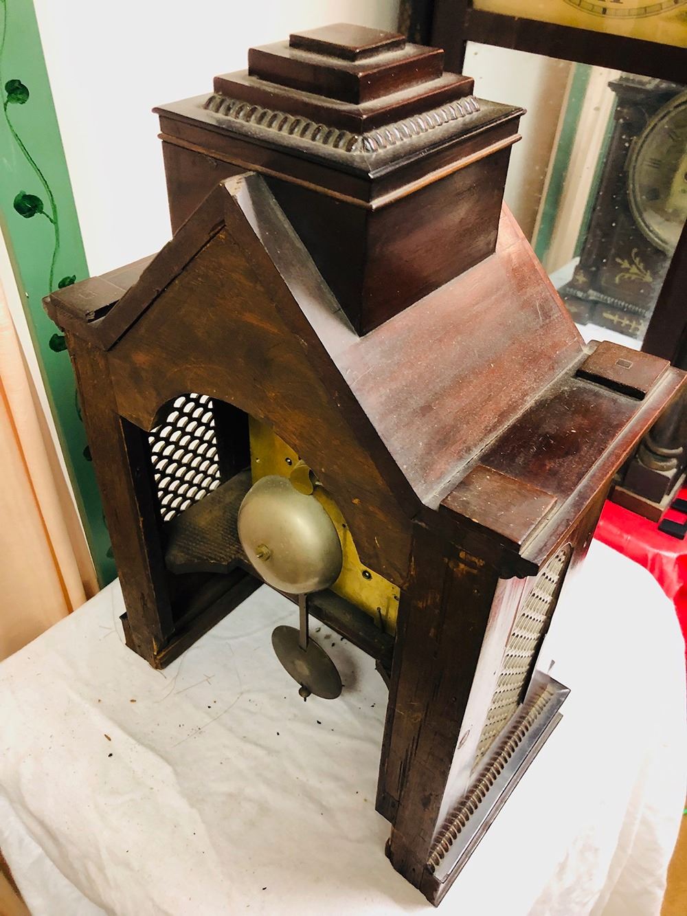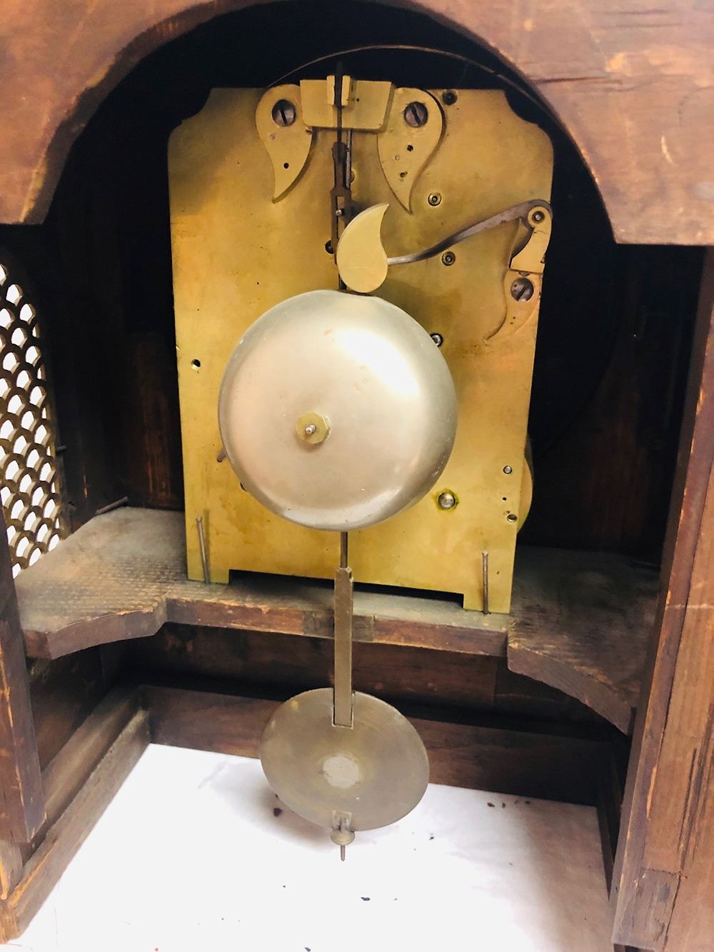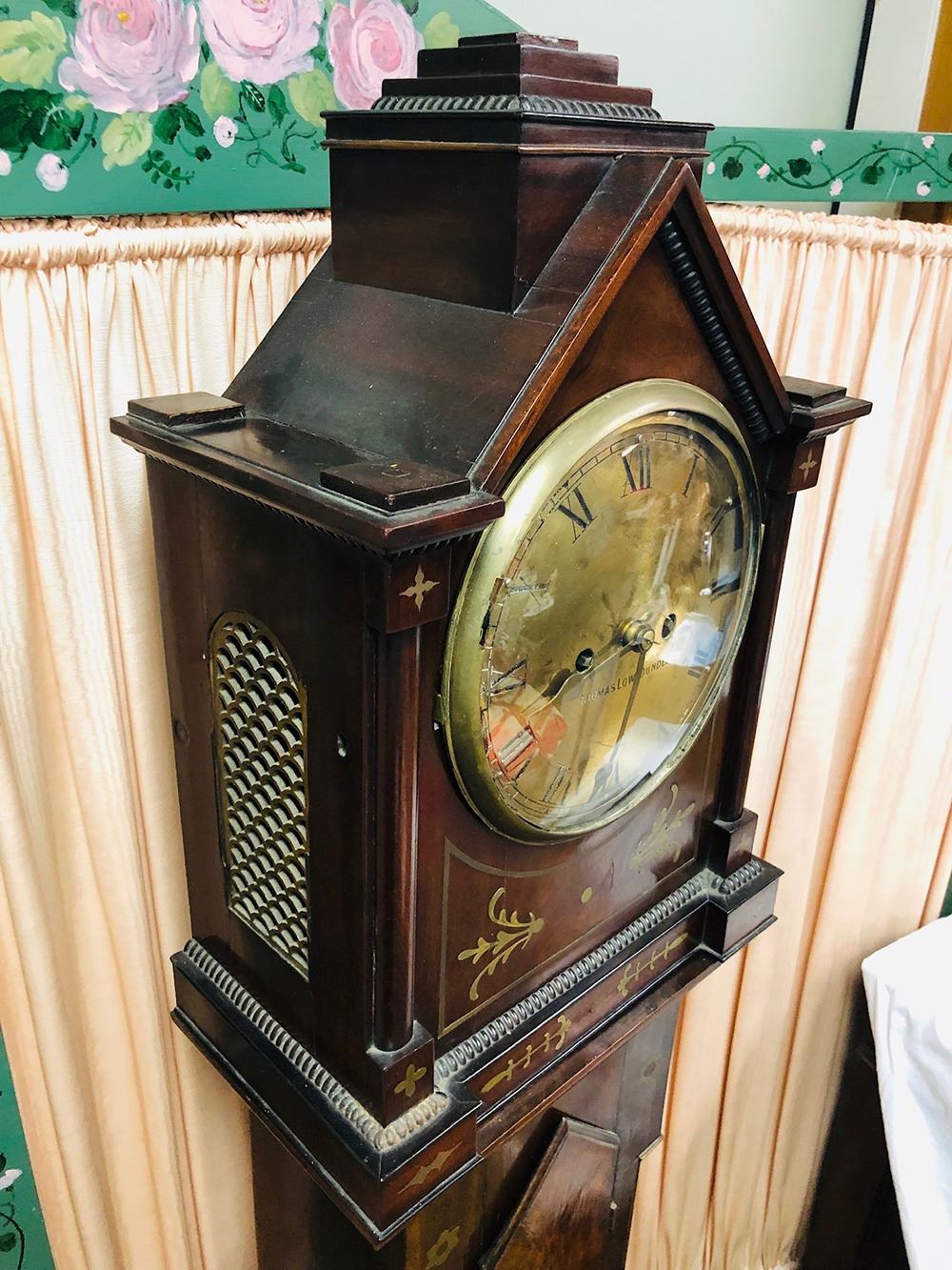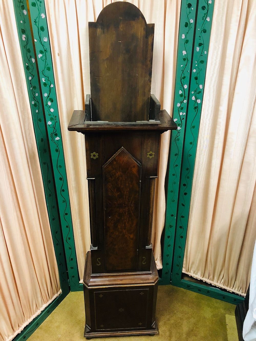 Beautiful English Grandmother clock by Thomas Low. Dundee with fusee movement. Beautiful inlay, burl on front, steeple top. Measures approx. 62" tall x 13.25" wide x 9.75" deep.