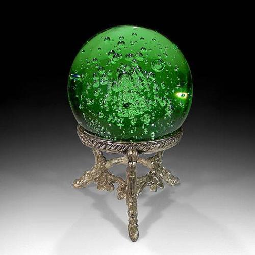 English green bottle glass magnum paperweight or mantel ornament, on a metal tripod. The large translucent green orb contains a multitude of assorted spaced bubbles. Separate, three-legged, embossed, metal stand, stamped, "L & L WMC 11-4". Diameter 5 1/2".