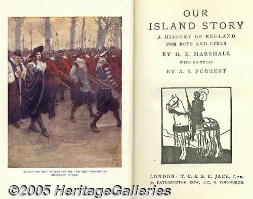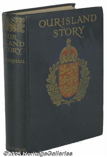 <B>English History Book "Our Island Story" by H. E. Marshall</B></I> <I>A History of England For Boys and Girls.</B></I> Published in London by T. C. & E. C. Jack, Ltd. Not dated but original owner has written Christmas 1923 on the first free endpaper. More than thirty color illustrations by A. S. Forrest- all present. Fine condition, 523 pages, blue cloth with gilt and decorative front cover and spine.