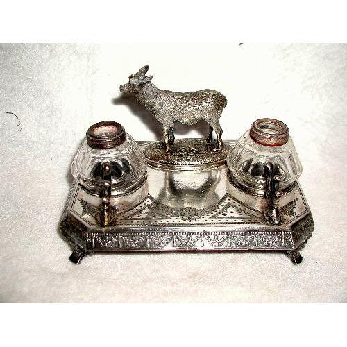 19th Century English silverplate over brass,footed double inkwell set depicts a deer standing on a bed of grass surrounded by flowers. The stand has a bead and garland design with drops displayed on the eight sides.Top has caladiums on two sides with spruce and garland on the other. Two strong arm pen supports,one with tiny showing of brass at base. Two crystal multi-sided removable inkwells are elongated on the bottom to sit securely in the dropped wells. One silver plated collar above the crystal has slight discoloration. Excellent condition other than areas mentioned. English hallmarks on the bottom with the number "P2240". Measures 7L X 4H X 5D.