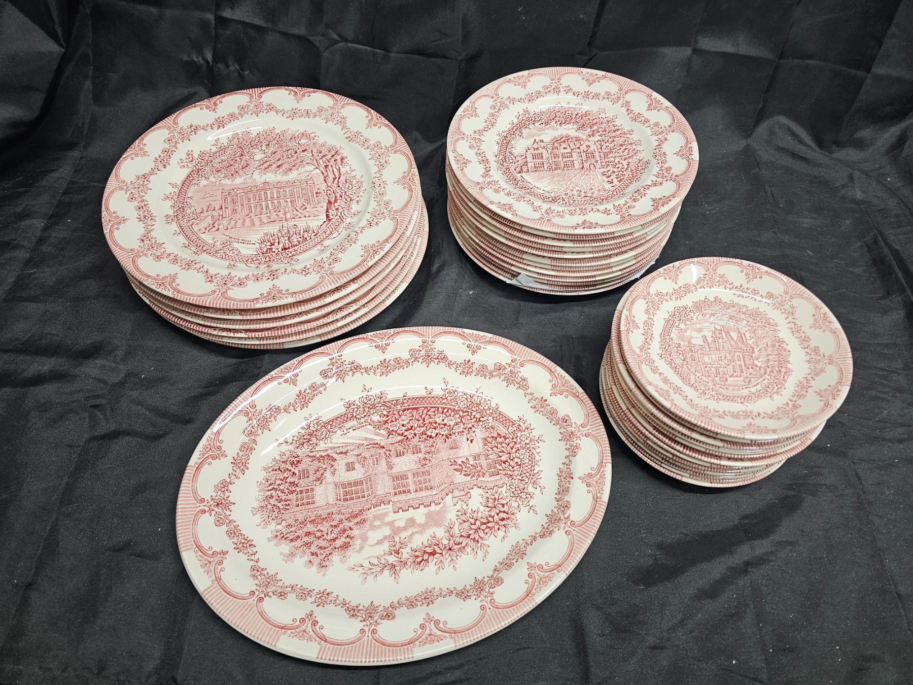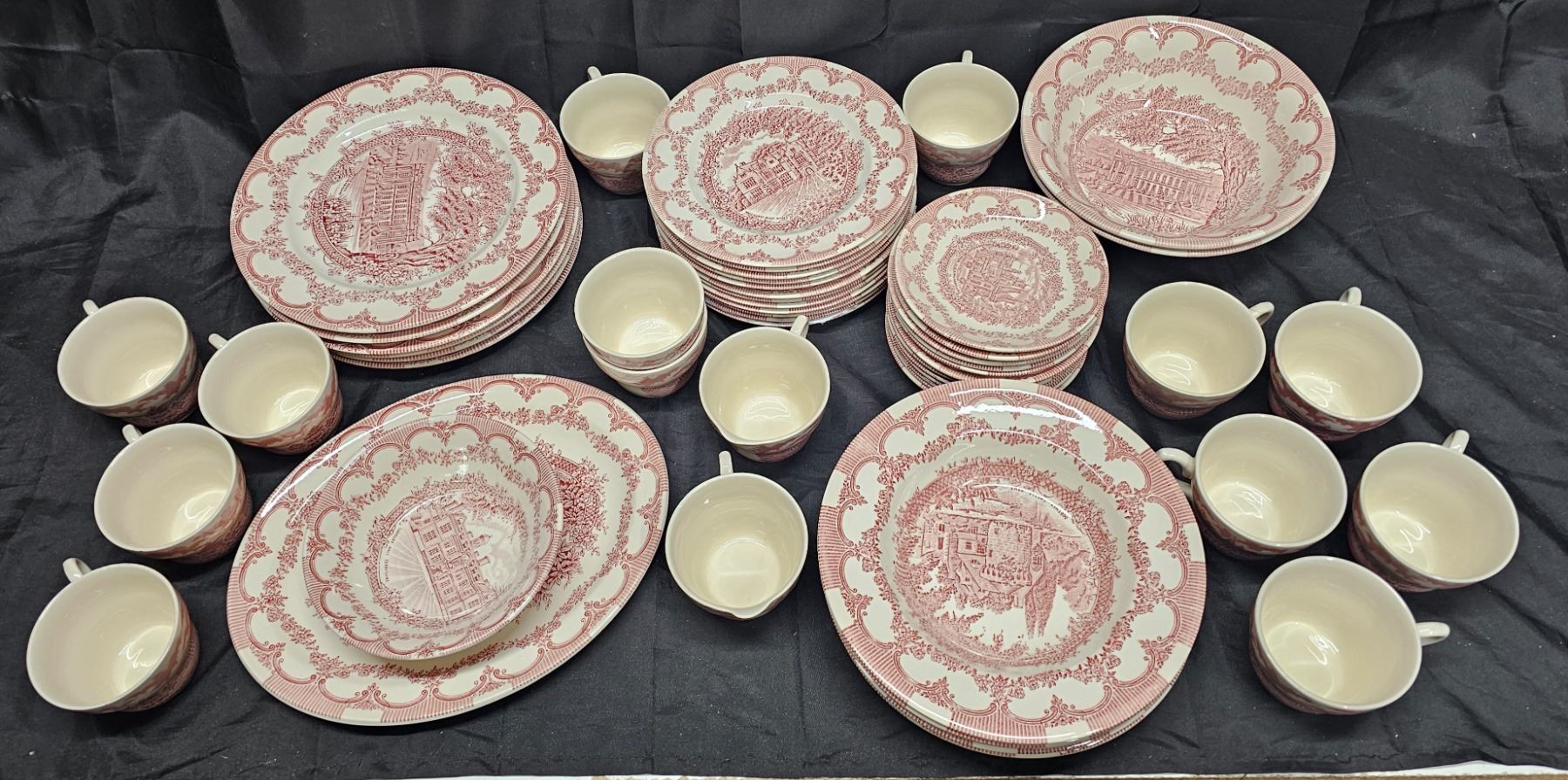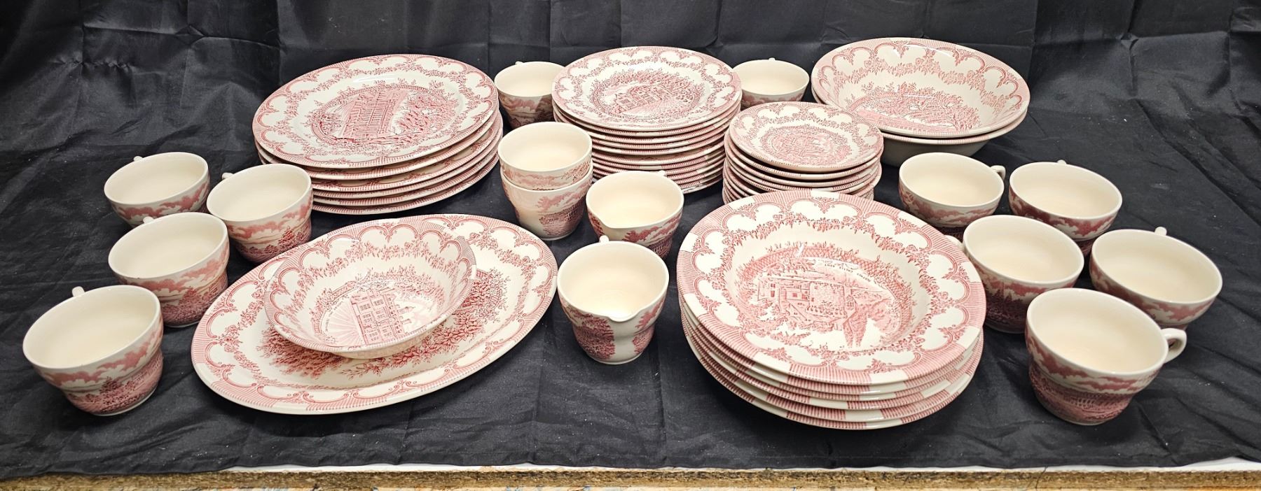 English Ironstone (England) Dishware Set, Red. Featuring Prominent Locations.