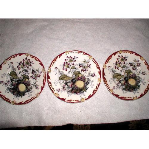 Trio of English ironstone plates C.1850-55 hand painted with deep rosy burgundy outline and yellow raised floral against an antique white background. The center design of purple and yellow plums along with floral is quite stunning. Marked on the back with hand painted numerals "9707" and three tiny blue markings alike on all. Incised spear head design with an "R" in the center. No nicks,chips or cracks. Three small brown spots on the face of one. Make a wonderful wall hangng when not in use. Measure 9L X 9W X 1H each. Price is for the trio.