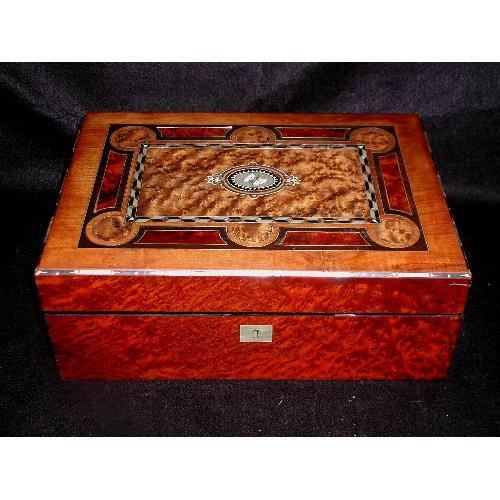 </font></strong>Most unusual and beautiful 19th century English lap desk has a walnut top and burl amboyna sides,front and back. Walnut burl has been used for the inserts surrounded by silver metal on the top and inlaid into ebony. Another,lighter tone of burl forms the interior of the six circles and forms the background for the exquisite outline of ebony and metal inter mixed with mother of pearl in shades of green,pink,blue and green. The body of the butterfly as well as the circle above and below the oval are also of mother of pearl. Unfotunately, does not show the true beauty in a photo. The edges of the box, all four sides,are inserts of metal,ebony and mother of pearl,forming a complete band around the lid. Remarkably,given the age and the vast inlay,only one tiny piece of metal is missing. The interior has the original purple embossed velvet,rust and black toned compartments below each end of the writing surface. Pen and two ink compartments lower front. Brass hinges,hardware and lock without key. Stunning lap desk in excellent condition., Measures 13L X 5H X 9D.</font>