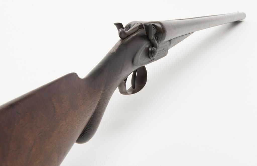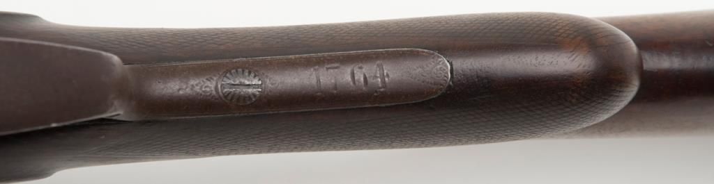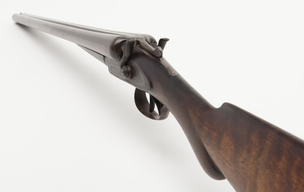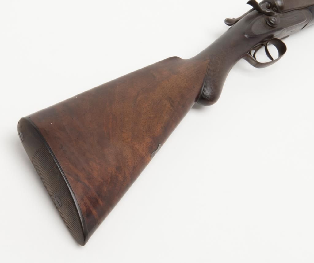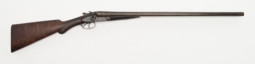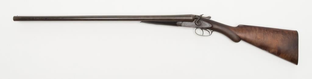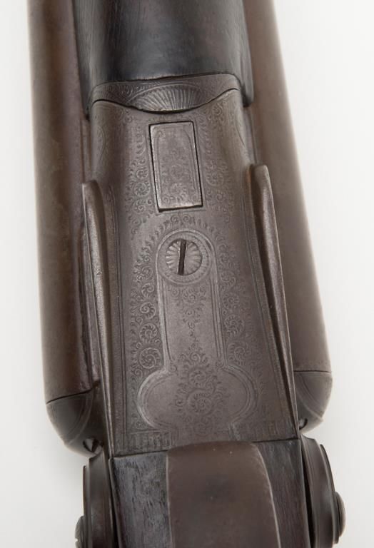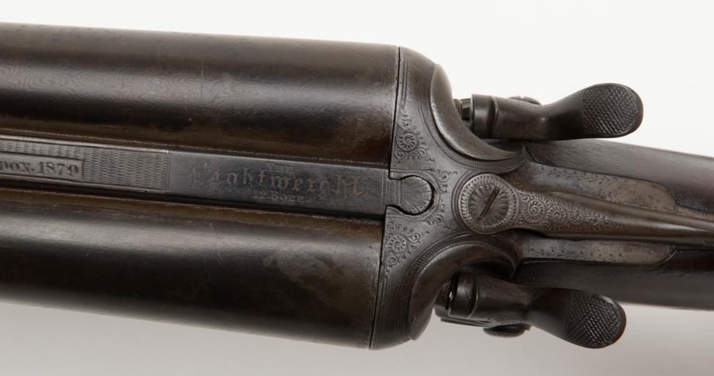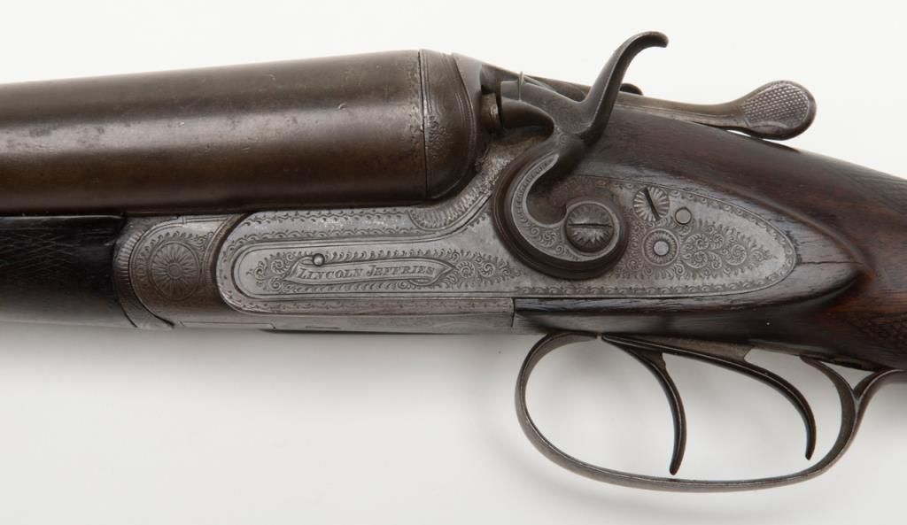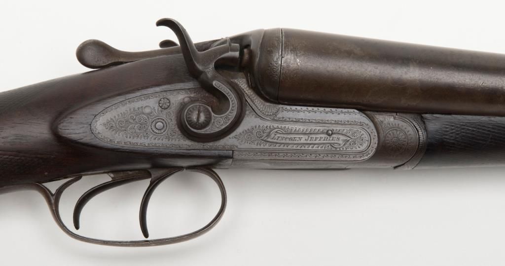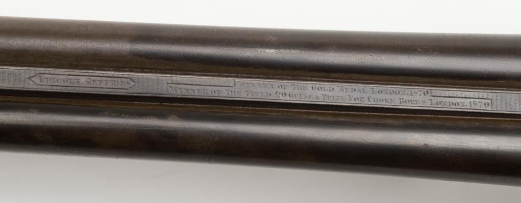 English Lincoln Jeffries SxS exposed hammers shotgun, 12 gauge, 26-1/2” barrels, double triggers, checkered wood stocks, horn butt plate, #1764 in overall good to very good condition showing a dark patina to metal surfaces, crispactions, good markings including legend on top barrel rib “WINNER OF THE GOLD MEDAL LONDON . 1870” and “WINNER OF THE FIELD 20 GUINEA PRIZE FOR CHOKE BORES LONDON. 1879”; also “THE LIGHTWEIGHT 12 Bore”; dark bores, worn but nicely grained butt stock with a small hairline crack on the left side behind the lockplate; good forend. (Antique). Est.: $350-$700.