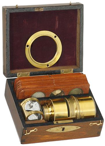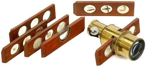 English Lucernal Microscope & Slides, c. 1820 Probably by "Carpenter", brass, with numbered set of 6 slides, complete in original case. - Excellent restored condition!<Br>