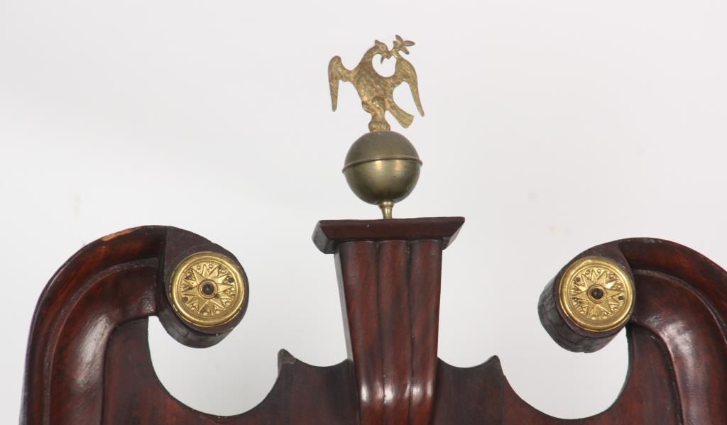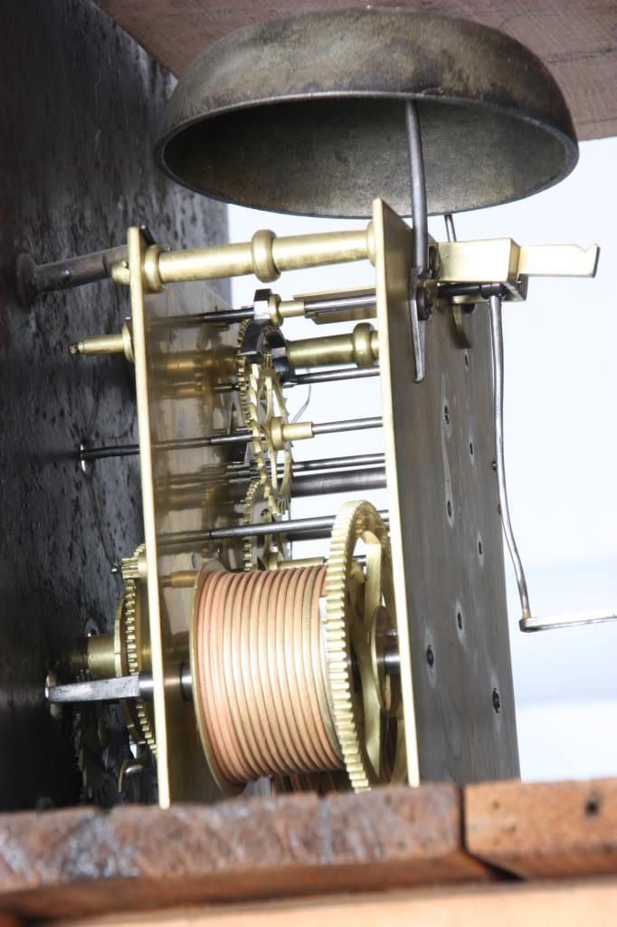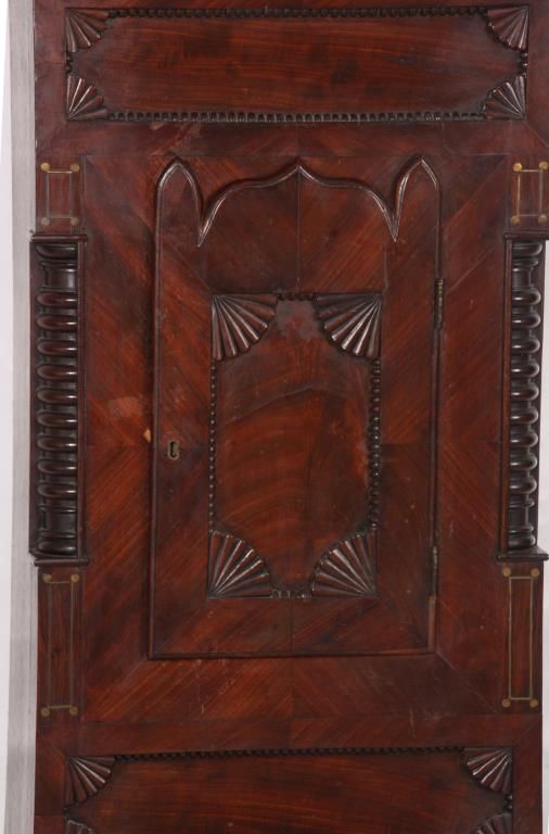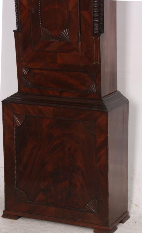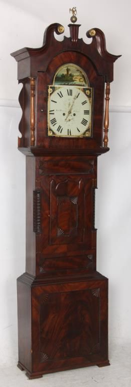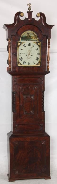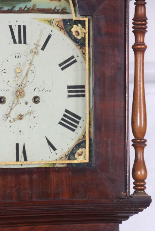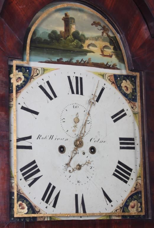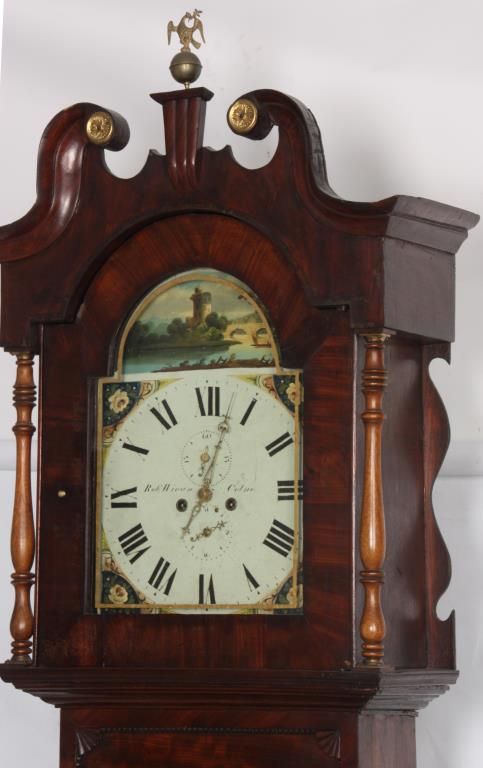 English Mahogany Grandfather Clock. Large painted metal dial has a 13 in. chapter ring with black Roman hour numerals, floral painted corner spandrels and country scenic painted arch, has a sub seconds dial over a 31 date sub calendar dial and fancy pierced and engraved gilt hands; signed Robert Wigan, Colne (circa 1820-1830). Brass 8 day weight driven movement has a recoil escapement, one hour rack strike mechanism with drop hammer strike on a steel bell at the top of the movement, brass pulleys and 2 iron weights, brass covered pendulum bob with steel rod. In an English mahogany case with broken arched pediment crest having gilt brass rosettes, eagle and sphere finial, turned corner columns on the bonnet, inset & carved panels in the door and base with turned quarter corner columns. In good condition, has an overcoated finish, nice flame mahogany veneer, a few seam cracks in the veneer but clock is overall very nice. 97 in. high x 12 in. wide x 28 in. deep.
