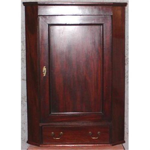 Absolutely beautiful English Mahogany Georgian Hanging Corner Cupboard. Orginal finish has a wonderful patina. One drawer with brass hardware, original brass ecstucheon and working lock and key. No repairs. The inside panel of the door as well as the left back panel and the bottom of the drawer are all chamfered. Very good condition!! Measures 15"D on top from the very back corner to the front.