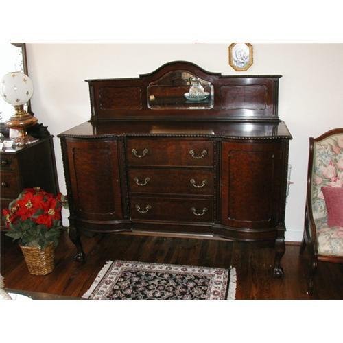 This English mahogany sideboard/buffet server is approximately 1890-1900. This stately piece sits on four ball and claw feet and is accented with gadrooned molding around the top and the bevelled mirror backboard. Three center hand-cut dovetailed drawers with shelves and bread/plate warmer are flanked by two locking cabinets (with key but handles are missing). The finish appears to be original and is in very good condition with no crazing or blistering. The piece is in good overall condition with age-related dents, dings and scratches. The green felt lining in the top silverware drawer is worn and a free roll of replacement green felt is included so the purchaser can replace it if desired. More photos available upon request. Approximate measurements are: 59 3/4" width, 20 5/8" depth, 57" tall to top of the mirror.