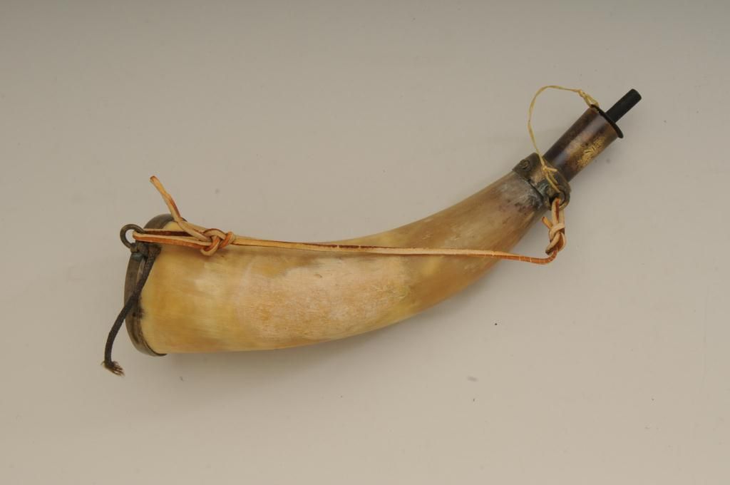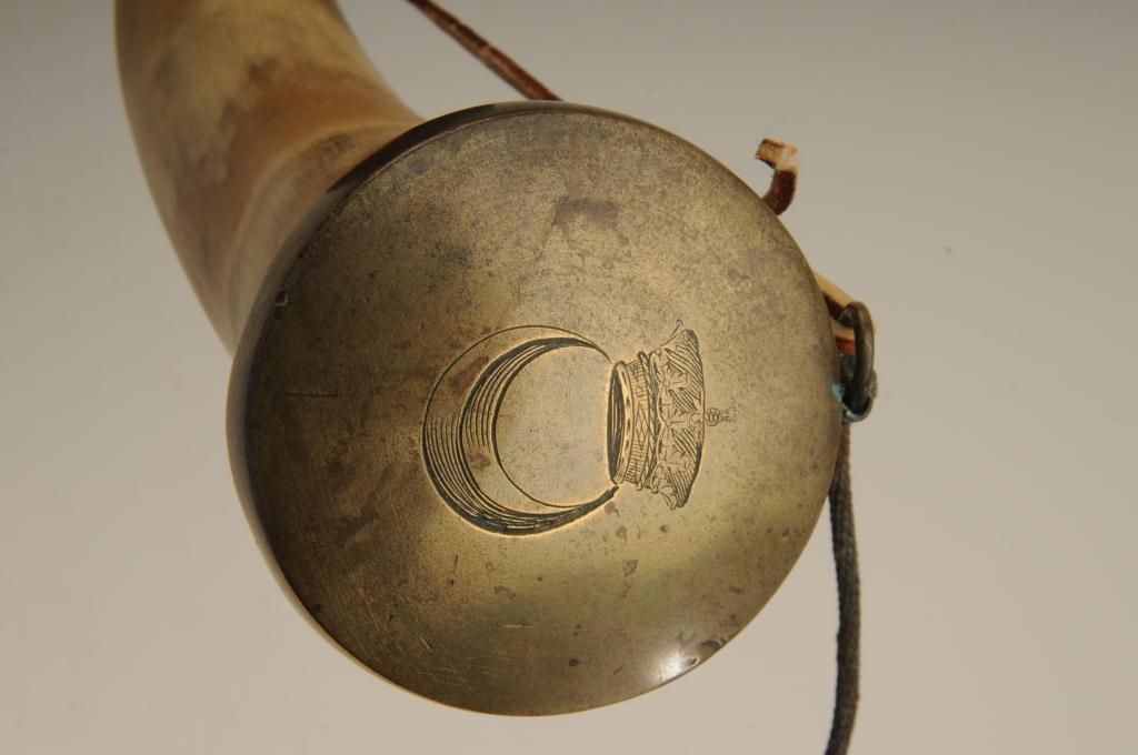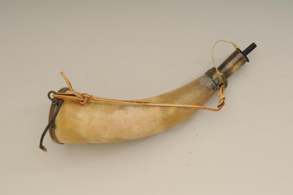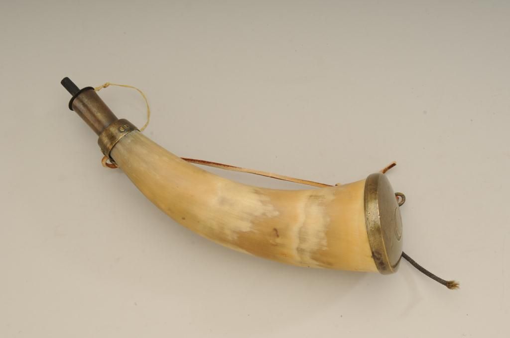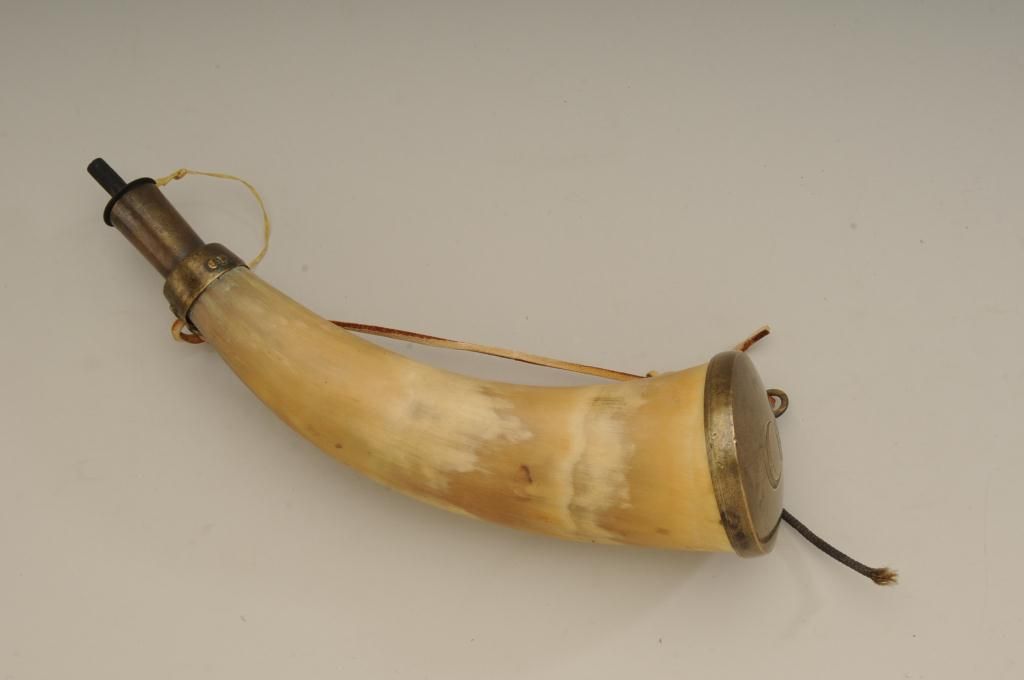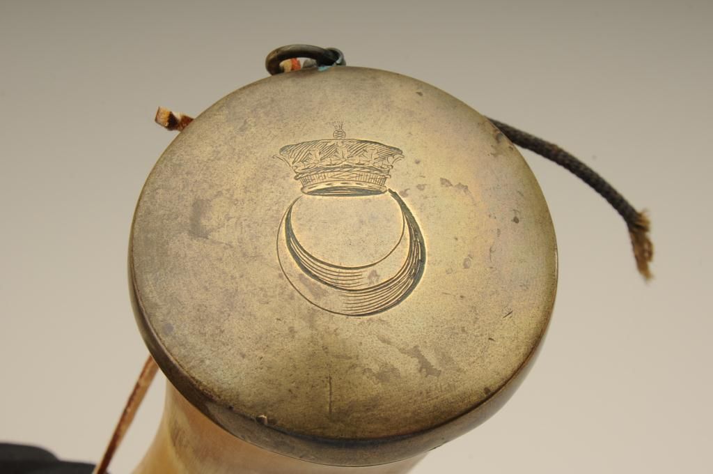 English Military horn flask used with Baker rifle musket circa 1800-1823, approx. 11” overall with brass plug and brass spout with brass measuring thimble; base plug is inscribed with the crest of the Earl ofNorthumberland; the spout is regimental marked “E 37”; overall very good condition with pleasing patina to all parts. Est.: $400-$800.