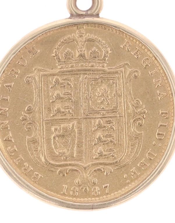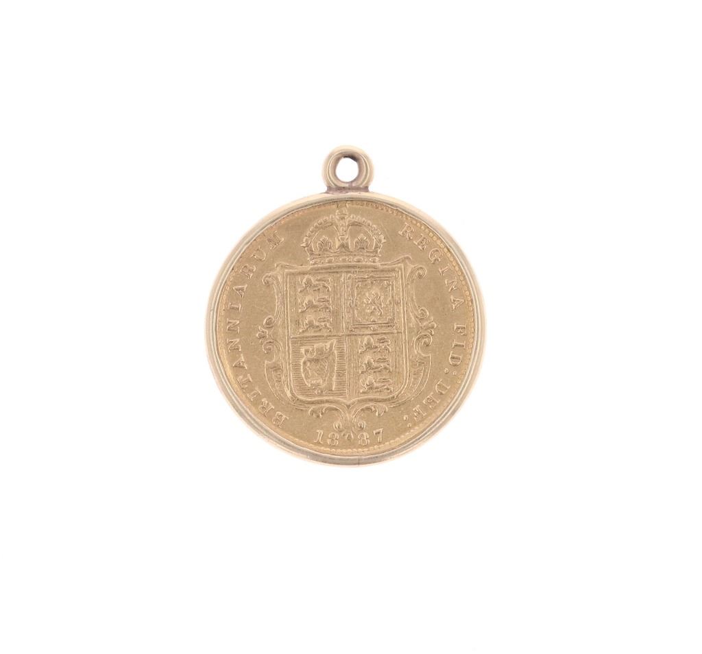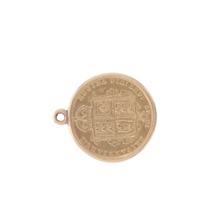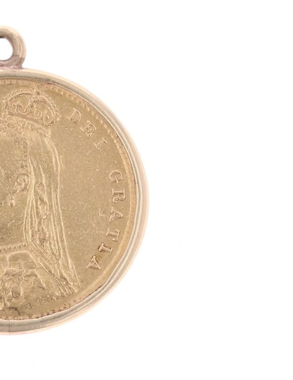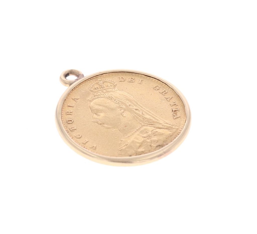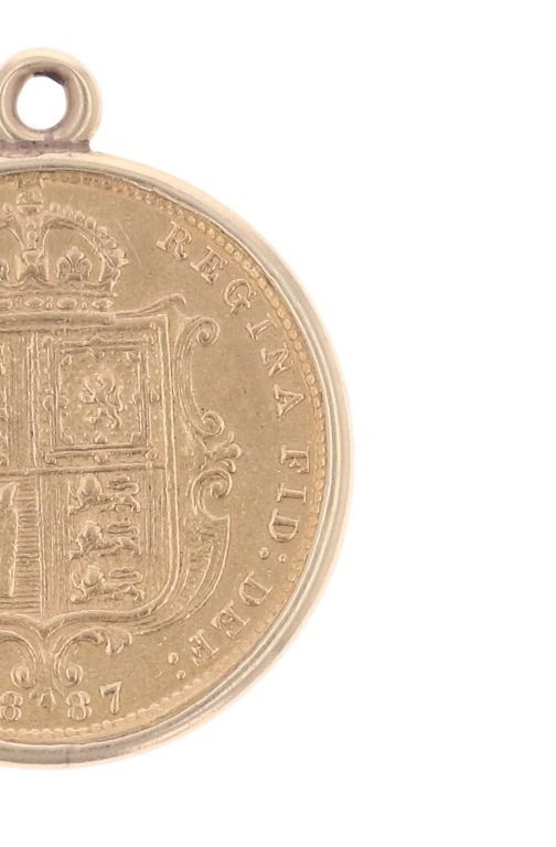 Featured in this lot is this English milled Victoria 1887 JH-gold half sovereign pendant. The coin pendant measures a wonderfully and professionally crafted gold construction that shows the Victorian queen and reads as follows: Victoria Dei Gratia. On the other side is a coat of arms that reads as follows: Britanniarum - Regina Fid: - Def: - 1887. The condition of this coin pendant is good with no obvious signs of damage and shows good overall condition. The measurements of this coin pendant is 7/8" x 3/4". The collective weight of this coin pendant is 4.6g.