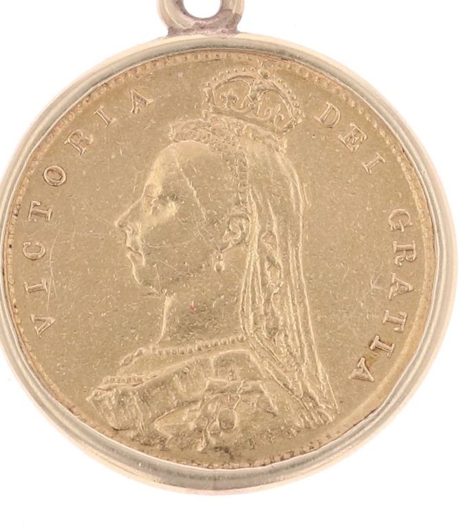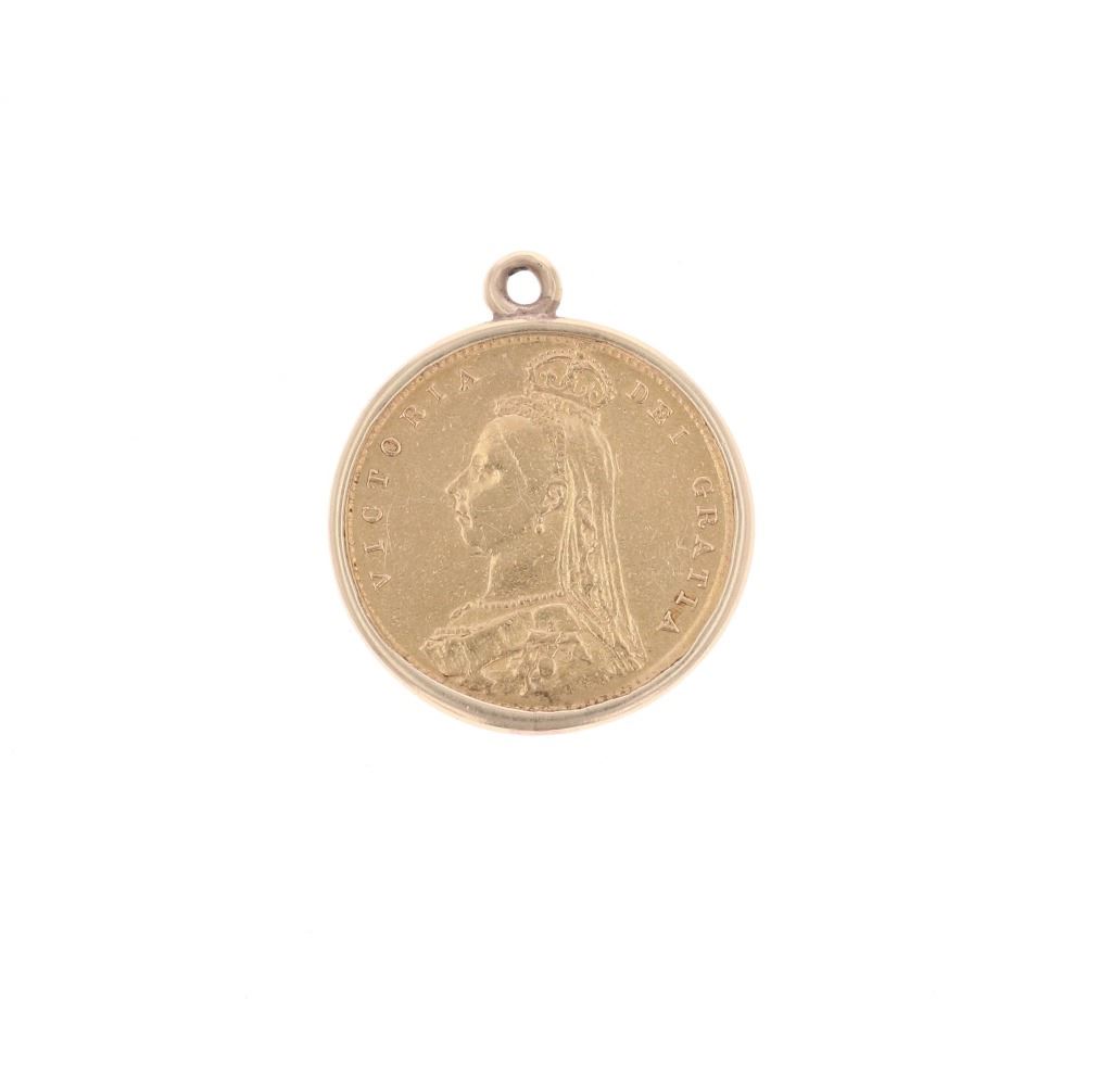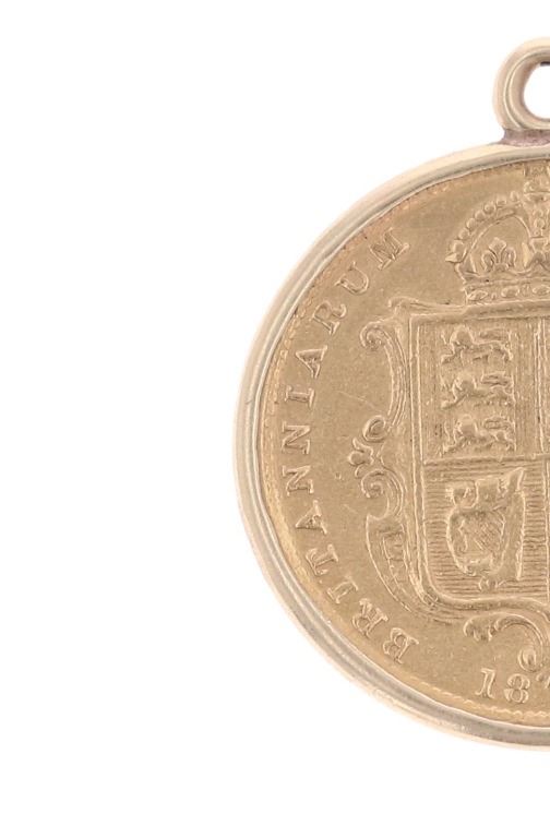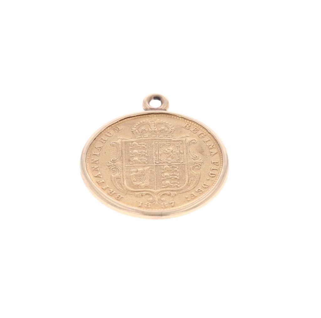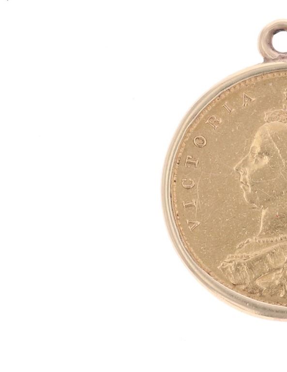 Featured in this lot is this English milled Victoria 1887 JH-gold half sovereign pendant. The coin pendant measures a wonderfully and professionally crafted gold construction that shows the Victorian queen and reads as follows: Victoria Dei Gratia. On the other side is a coat of arms that reads as follows: Britanniarum - Regina Fid: - Def: - 1887. The condition of this coin pendant is good with no obvious signs of damage and shows good overall condition. The measurements of this coin pendant is 7/8" x 3/4". The collective weight of this coin pendant is 4.6g.