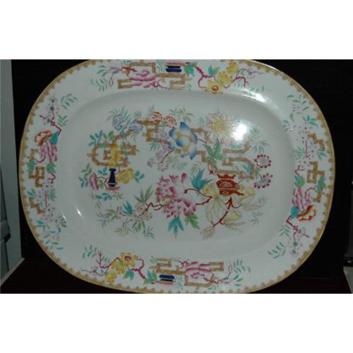 English Minton Large Oval Porcelain Tray in the Chinese Tree Pattern,Early 20th Century,marked on base pink Minton England crowned globe stamp. pink retail bear mark " S & Gump Co, San Francisco". pattern no. 2064. Good condition.