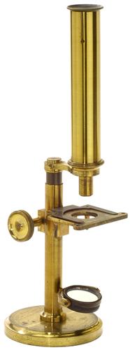 English Monocular Brass Microscope, c. 1850 By Horne, Thornthwaite & Wood, 123 Newgate St. London (engraved on round foot), 1 unmarked objective, 1 unmarked ocular, 1 brass container, 1 specimen, mahogany case, size 7 1/2 x 6 x 4 3/4 in., height of the instrument: 12 1/5 in.<Br>