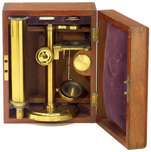 Englisches Monokular-Mikroskop, um 1850 Horne, Thornthwaite & Wood, 123 Newgate St. London (signiert auf rundem Fuß). 1 unbezeichnetes Objektiv, 1 unbezeichnetes Okular, 1 Messingdose, 1 Präparat, Mahagonikasten 19,5 x 15,5 x 12 cm. Höhe des Instruments: 31 cm.