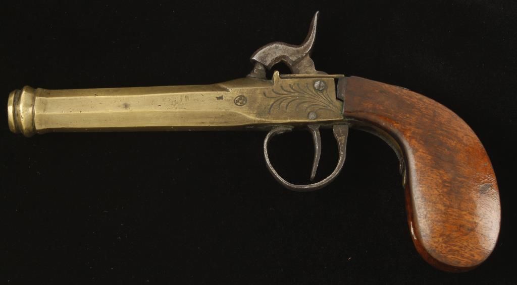 Early brass percussion muff style pistol with 3-1/2" octagon barrel. Wood teardrop shaped grips. English Liege proof marks. Action in working order. Grips do not fit properly. In overall good condition.