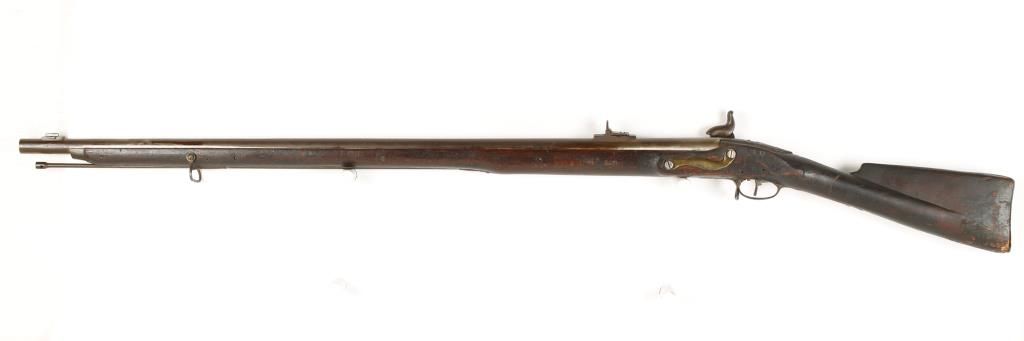 Northern European Musket converted from flintlock to percussion. Crown "N" proofs. Full length military style wood stock with flip up rear sight. In overall good condition. *Antique Firearm*