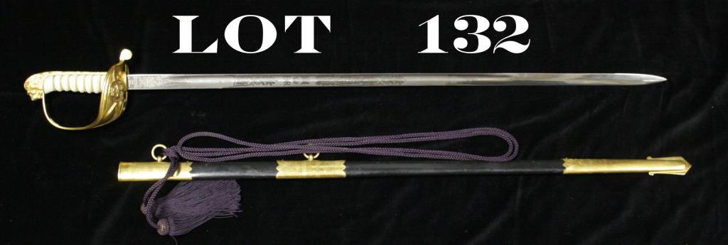 English Naval Officer’s dress sword and scabbard by Wilkinson, approx. 38” overall with an approx. 31” etched blade with “John Preston Hansen” etched on the blade, gold washed naval insignia guard with lion’s headpommel and wire wrapped white rayskin grip. The sword and scabbard are in overall excellent condition; the scabbard has gold colored engraved mounts with two hanging rings and a purple cord and knot. Est.:$250-$500.