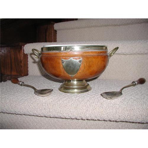 This is a large English Oak and Silverplate Salad Set. The Oak bowl is resting on a S.P. Stand. The Rim and emblem on the bowl are also S.P. It is Marked EPNS. Inside the wooden bowl is a white ceramic liner. The Utensils are also S.P. and Oak. It is very hard to find the original set with the white ceramic bowl in tact. The white liner has a small 1 1/2 inch line crack, but no chip. Barely noticeable. These sets are getting harder and harder to find.