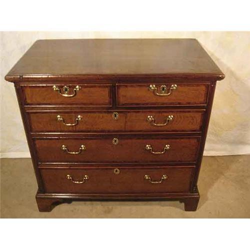 English oak and mahogany 2 over 3 drawer chest with inset quarter column, original brass handles and feet, great color and patina