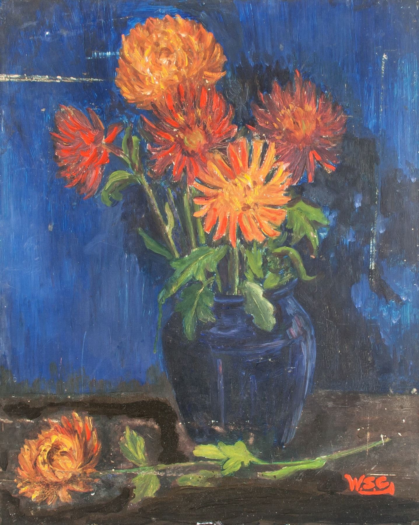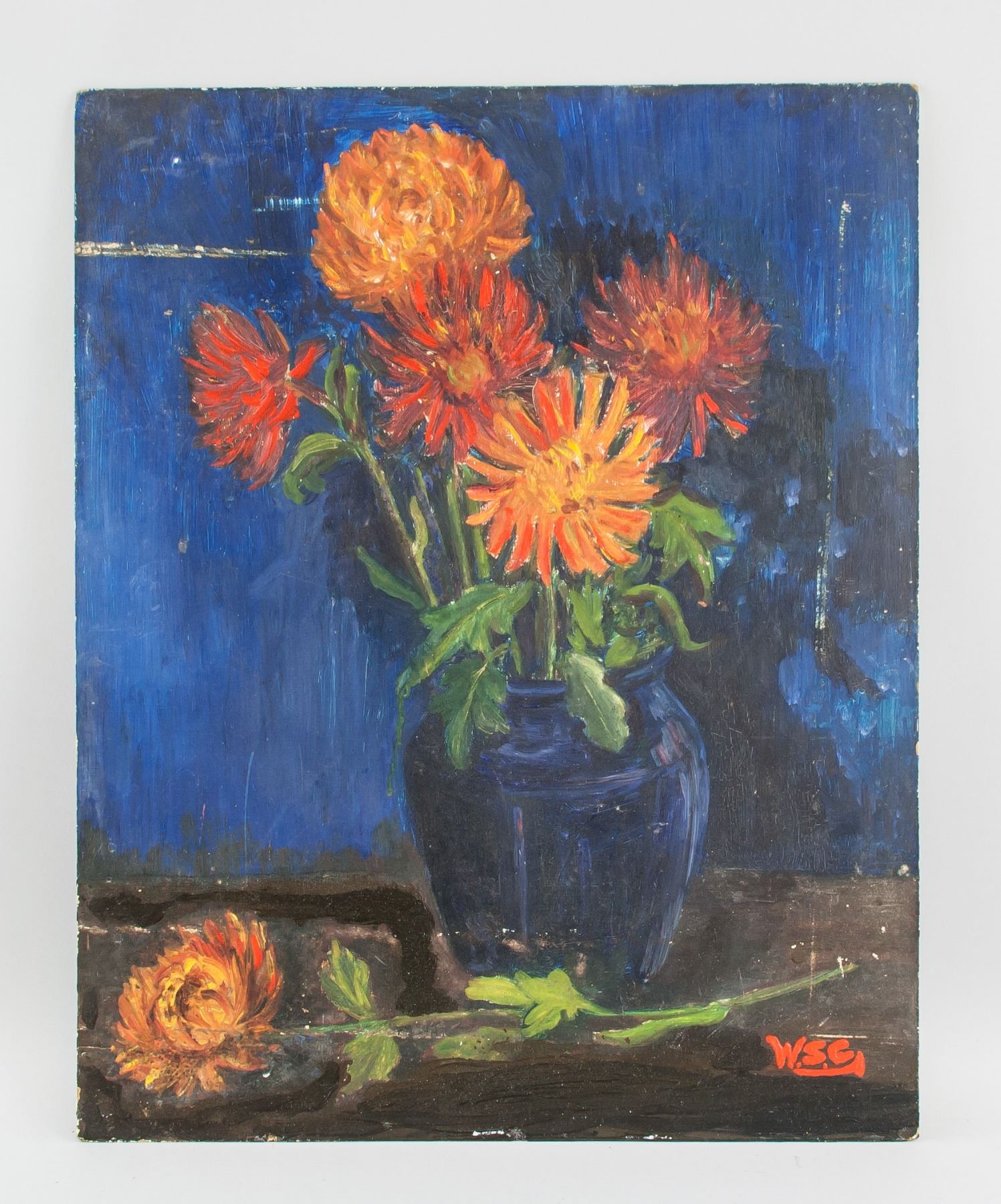 Oil on board, Featuring a still life rendering of flowers. Signed WSC and possible initials of Winston Churchill. Verso featuring label inscribed Winston Churchill 1874-1965. 19.7 x 15.9 inches (50 x 40.5 cm).