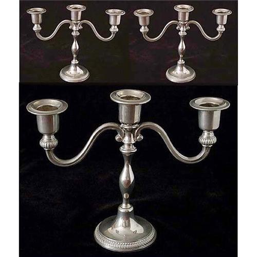 Very nice pair of English silver-plated, three-light candelabra. They can be taken completely apart and reassembled (parts screw into each other) for cleaning and to minimize shipping costs. They are marked "Made in England" and "E. P. Zinc Silver Plated." In very good used condition, as shown. Please ask questions, request additional photos and shipping costs before buying.