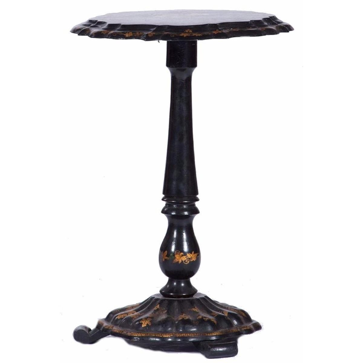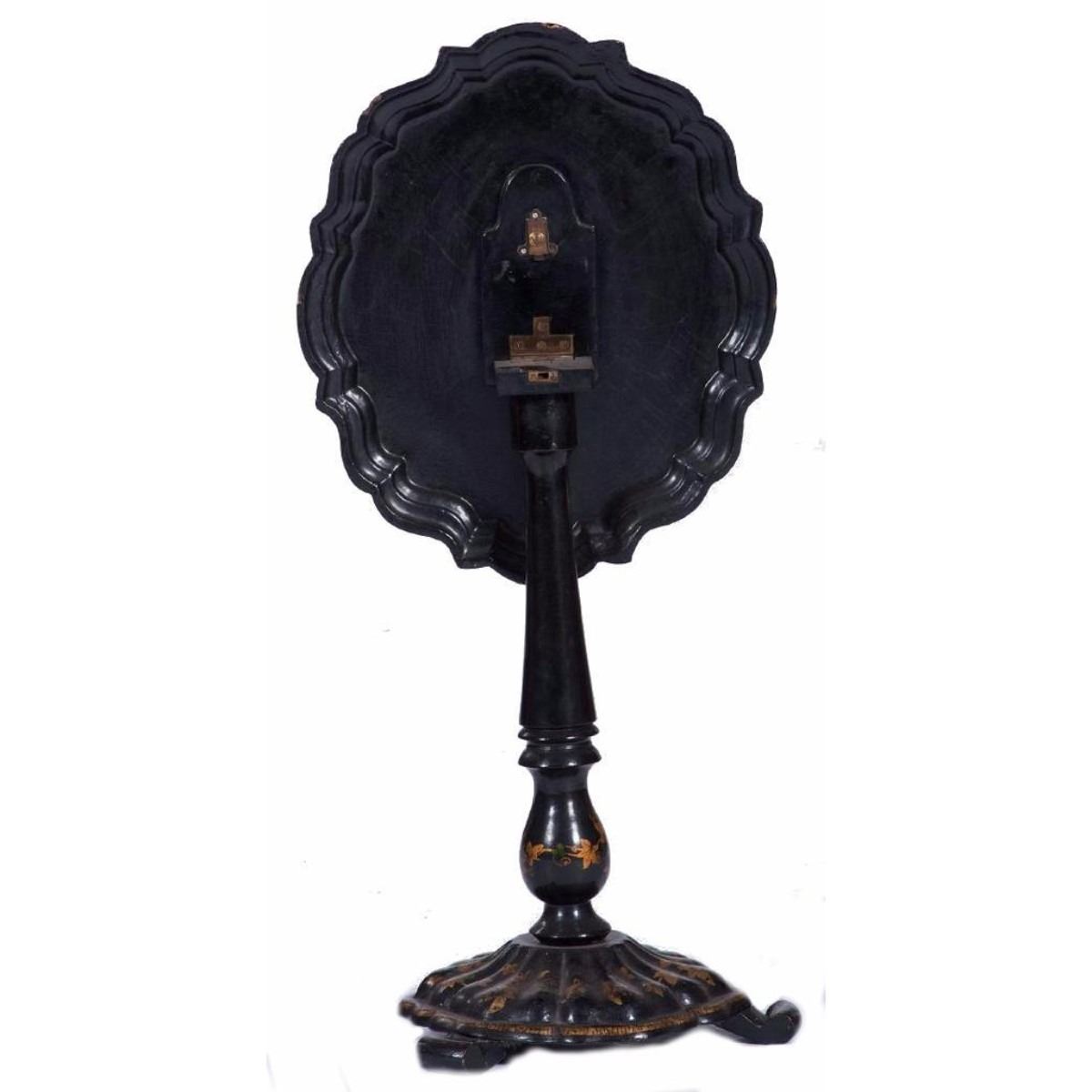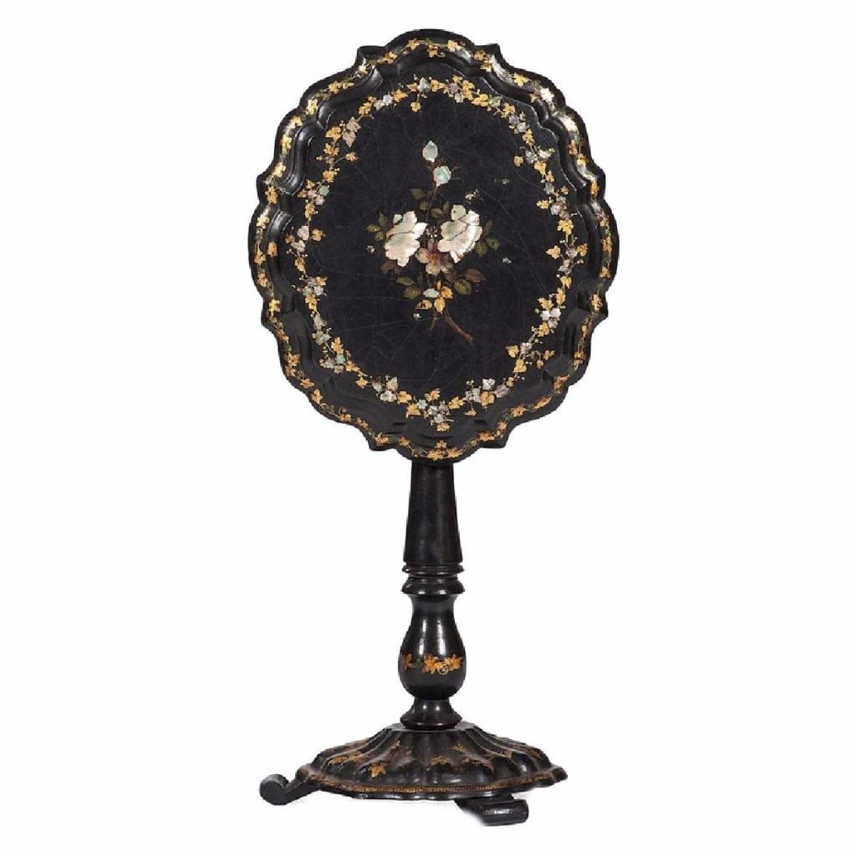 English, 19th century. An ebonized papier-mche tilt top table, having a scalloped oval tilt top surface with foliate gilt and mother of pearl inlay design, on a turned support and scalloped base, rising on scrolled feet; ht. 27.5, wd. 22.5, dp. 19 in. Provenance: ex boultinghouse & hall antiques, Midway, Kentucky. Property from the collection of Dr. M. Donald Hayes. Condition item is in very good condition.