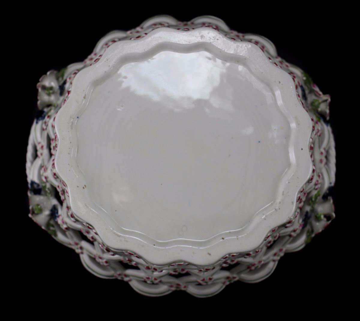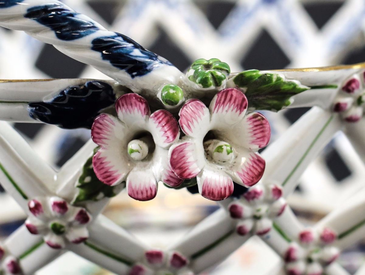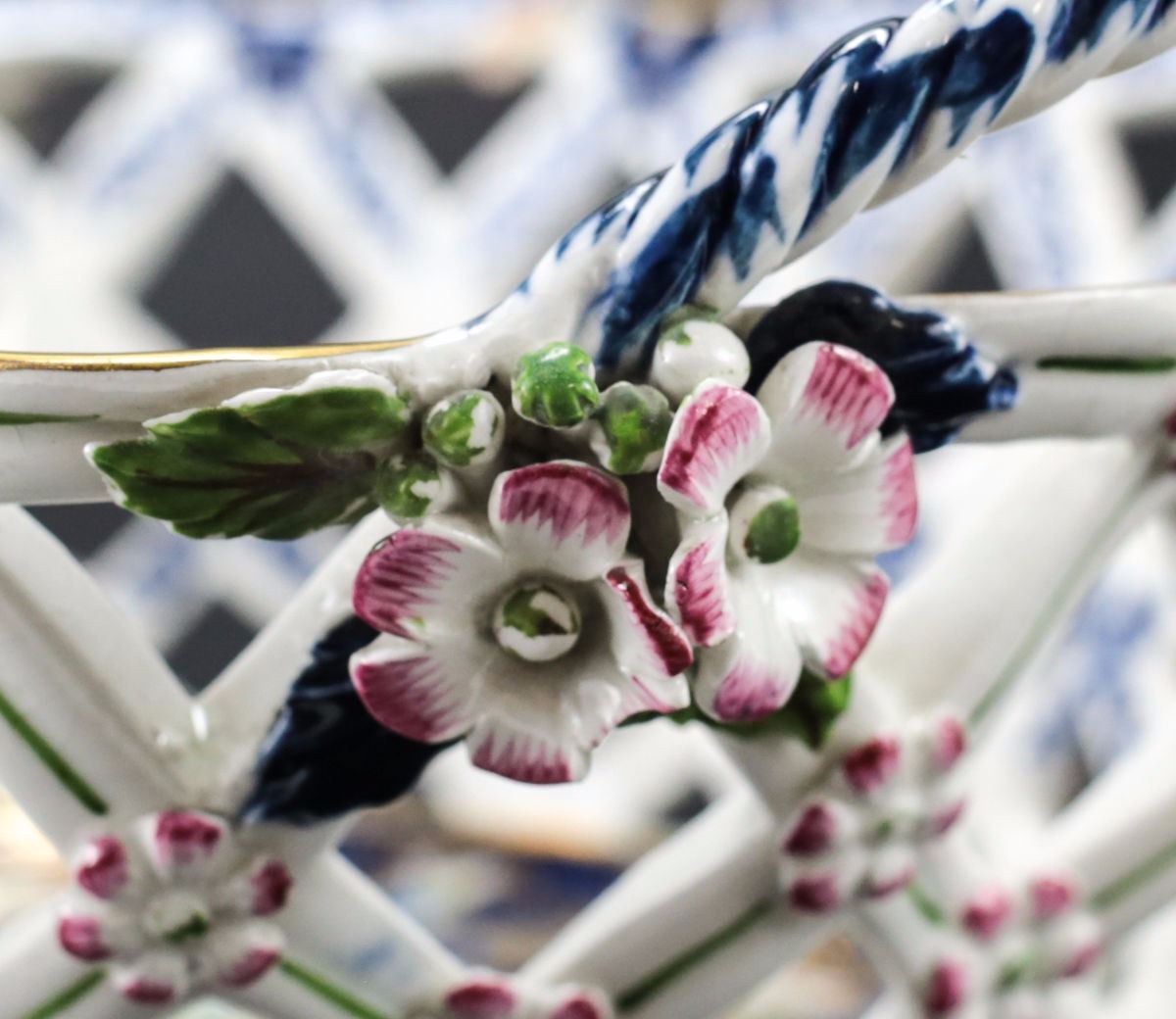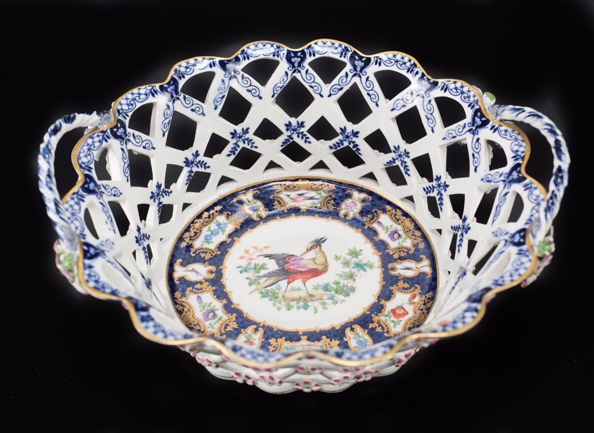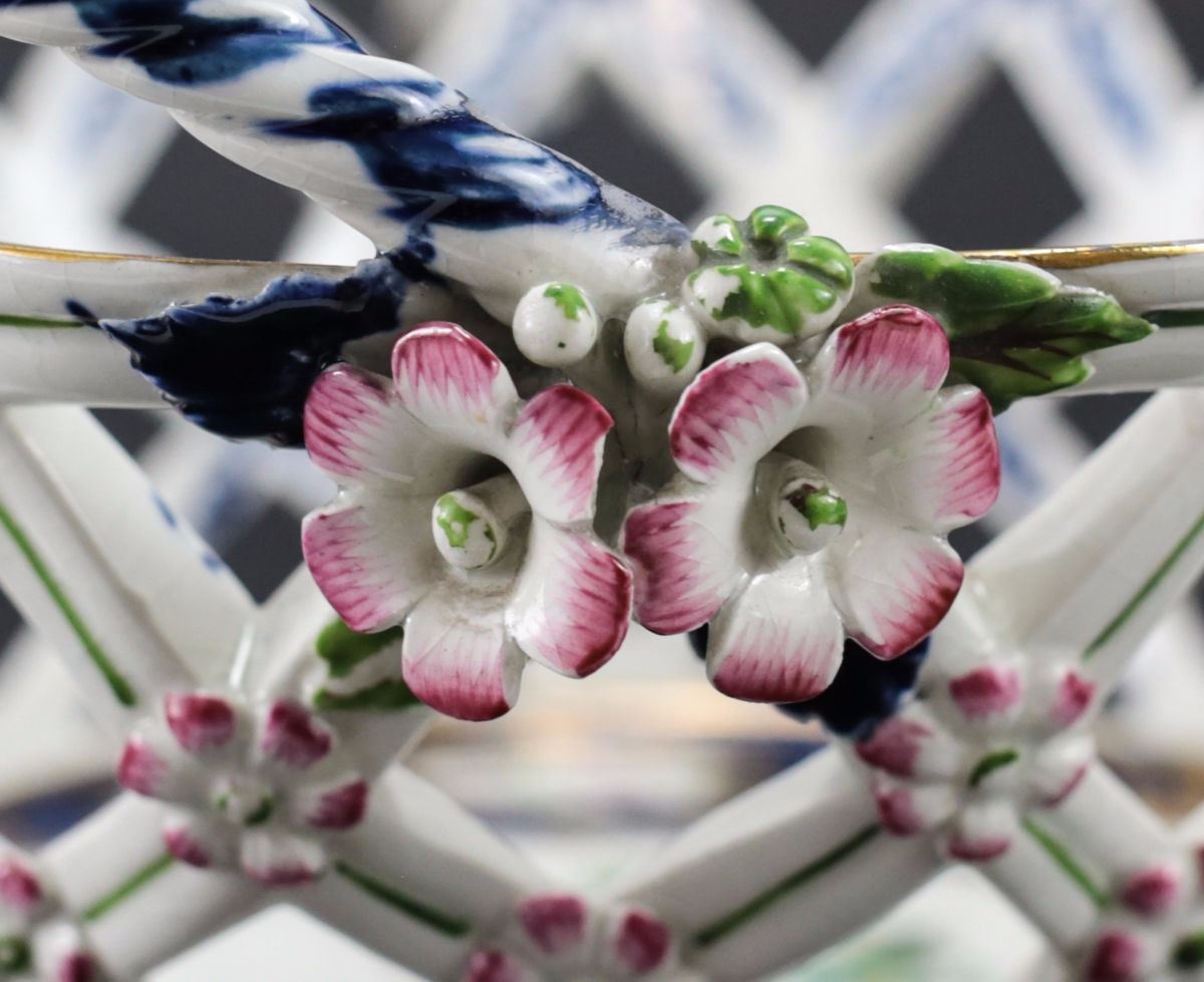 A 19th Century Royal Worcester or Samson scale blue reticulated porcelain basket. Decorated with applied flowers along exterior. Center of basket with hand painted bird and cobalt blue bowl.
