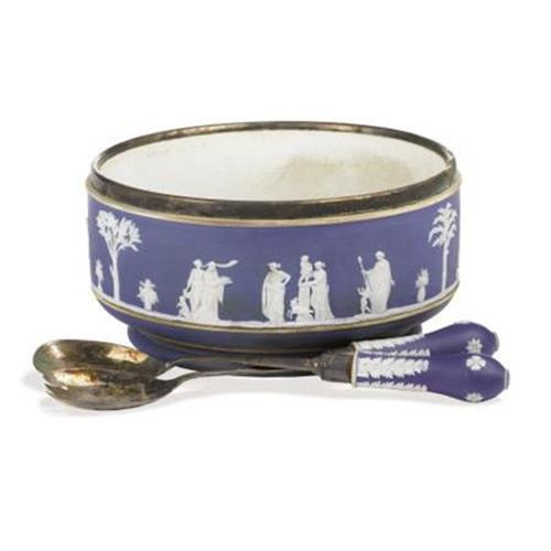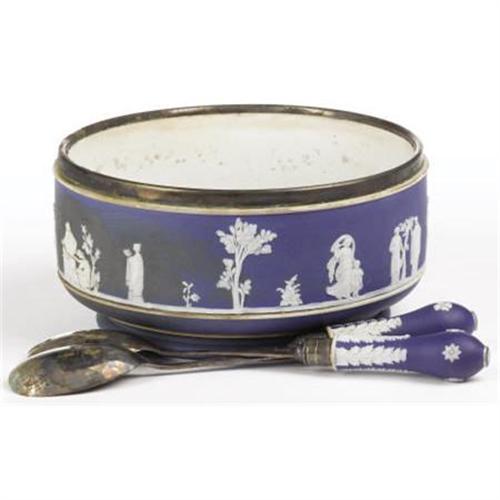 <B>An English Porcelain Salad Set<BR></B></I>Wedgwood<BR>Circa 1900<BR>The set comprising a blue jasperware and silver-plate salad bowl, spoon and fork, the bowl decorated with white relief classical figures<BR>Impressed mark to the underside<BR>The bowl: 4.5 inches high x 9 inches diameter<BR>Provenance: Former estate of Pearle Collins of Wichita Falls, Texas<BR><BR><b>Shipping:</b> Requires 3rd Party Shipping (<a target="_blank" href="http://www.heritageauctions.com/common/shipping.php">view shipping information</a>)