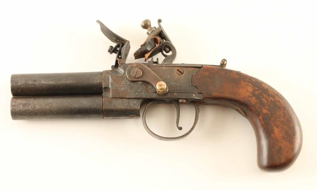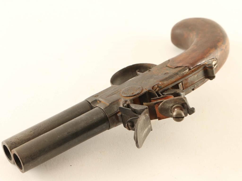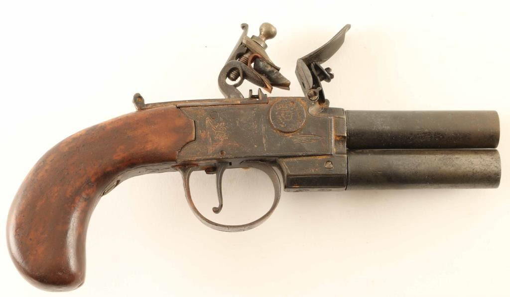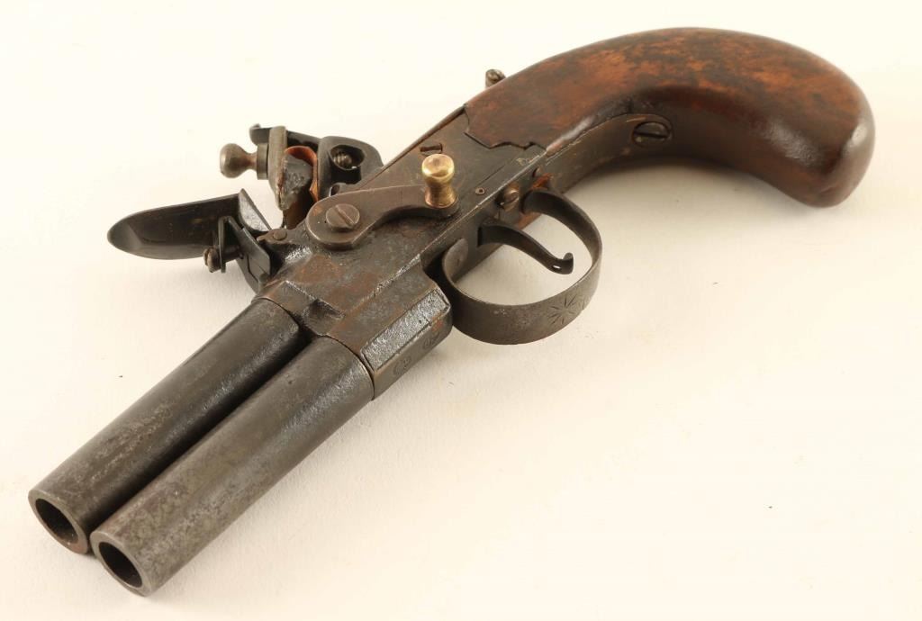 Antique English made over/under double barrel flintlock pistol with approx. 42 caliber bores. Features light coverage engraving, 2.5" twist-off barrels, smooth single trigger, barrel selector lever, and wood grip. Pistol shows age with dark patina and some light surface rust. Action is in good working order, the smooth bores are good and the wood stock is good. Condition is near Good. ***Antique Firearm***