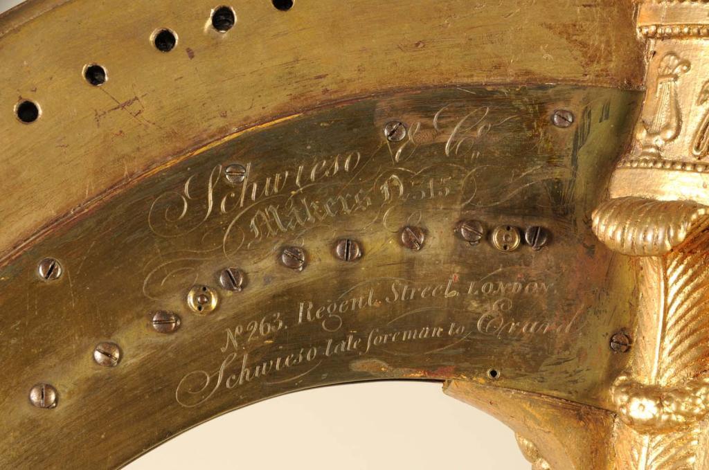 Description 19th Century. By J.C. Schwieso, London, Model N. 315. Fluted columnar front section topped by gilt gesso capital with rams' heads. Brass plate engraved "No. 263. Regent Street, London, Schwieso late foreman to Evard." Condition (Excellent). Size 66 - 1/4" H.