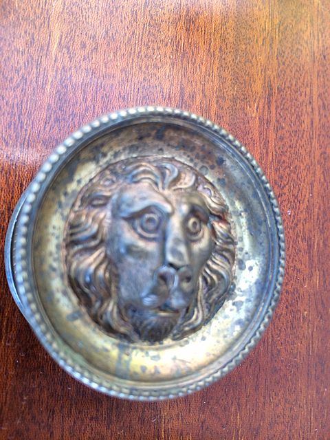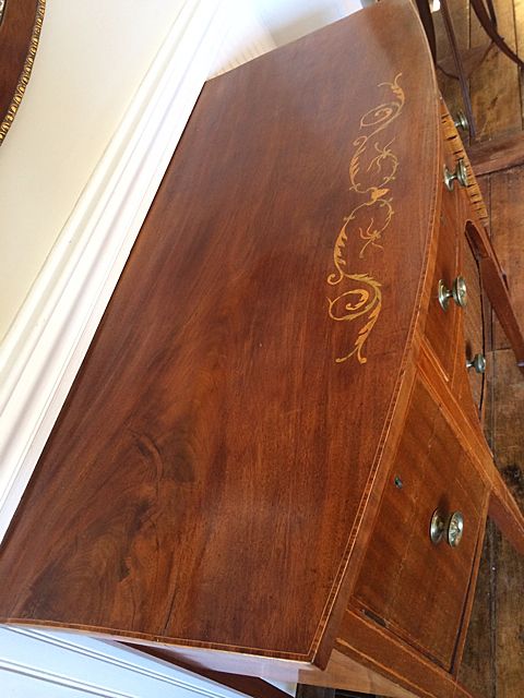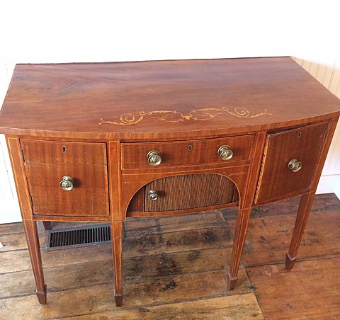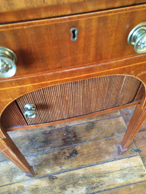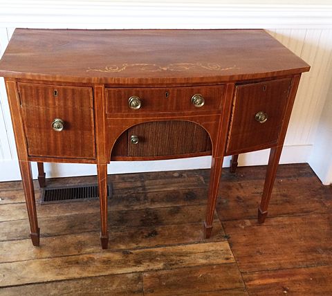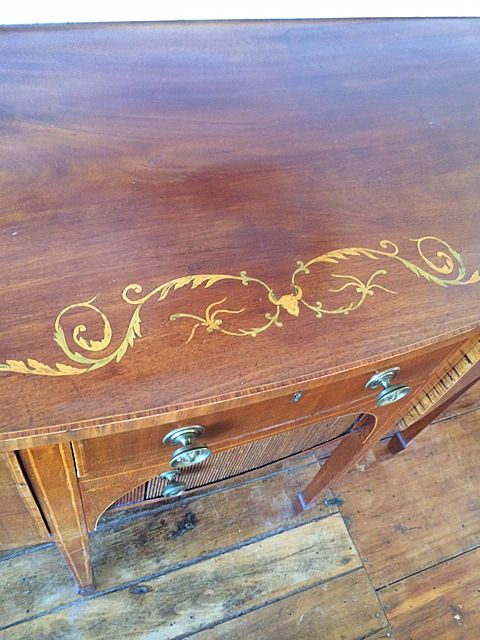 Beautiful English Regency miniature size side board, well over 100 years old. Marquetry inlay on top and line inlay, lion's head pulls, tambour roll mechanism on doors. Measures 35" long x 23" deep x 35" tall. From estate home in Litchfield, CT, built in 1764. Very rare to find one in this size!