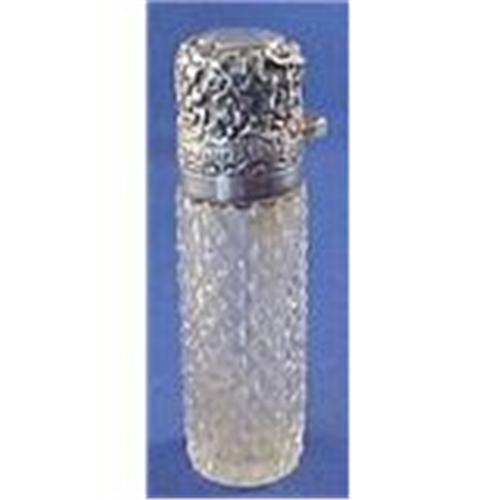 This is an elegant English scent or perfume bottle with repousse sterling silver top. The top is fully hallmarked for Birmingham. I believe the date mark is 1918-19, and the maker is C M. The top is fancy and has a place for a monogram. It snaps tightly shut and is hinged. Also included is the stopper or dabber. The glass is a diamond pattern. This piece measures 3" tall and is in great condition.