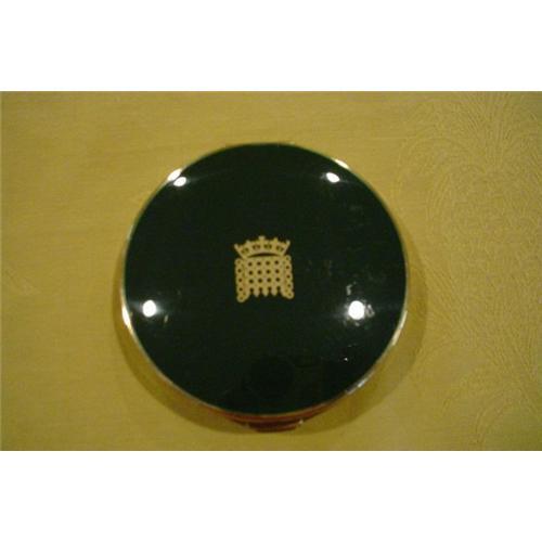 BRING THE HOUSE DOWN with applause. This stunning 1960 House of Commons British Parliament Powder Compact by Stratton will keep you looking your best. A lovely compact with the symbol of the British House of Commons on a dark green background is most collectible. Signed Stratton, England back. <p>Near Mint Condition. Ring inside to hold solid powder, no sifter or puff. The diameter is about 3 inches.
