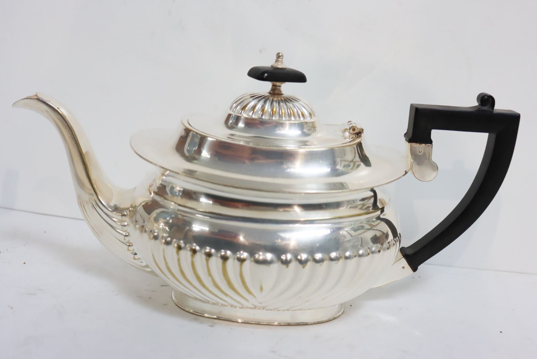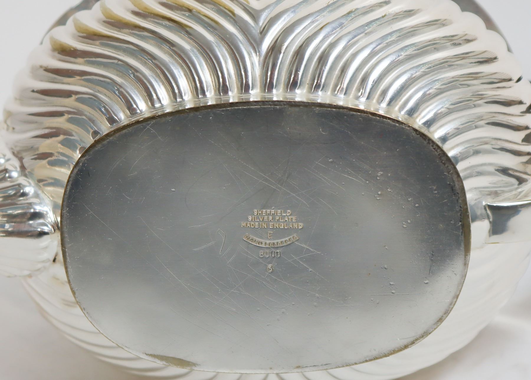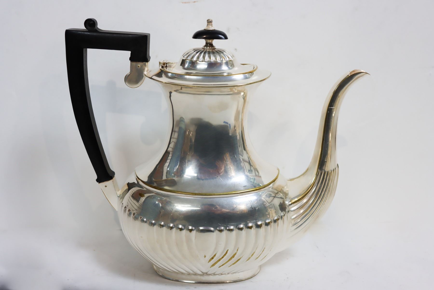 Coffee pot and teapot set by Sheffield. Marked Sheffield and made in England on the undersides. The sizes are 9 1/2 x 10 1/2 x 4 in and 6 x 12 x 5 in.