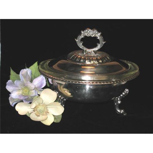 Very nice Silverplate Chafing Dish/Casserole with Pyrex glass insert. Made by the English Silver Mfg. Co. An American Silverplate Company, specializing in only Silverplate products. This item displays a very pretty pattern and eye appeal. A Pyrex dish is nestled in the beautiful footed dish. Minor dent in bottom of dish, is not obvious to the eye. The Pyrex dish, is not the original dish and has small chip on handle, Can be replaced. Lovely Piece. Hallmarked English Silver Manufacturing Company.