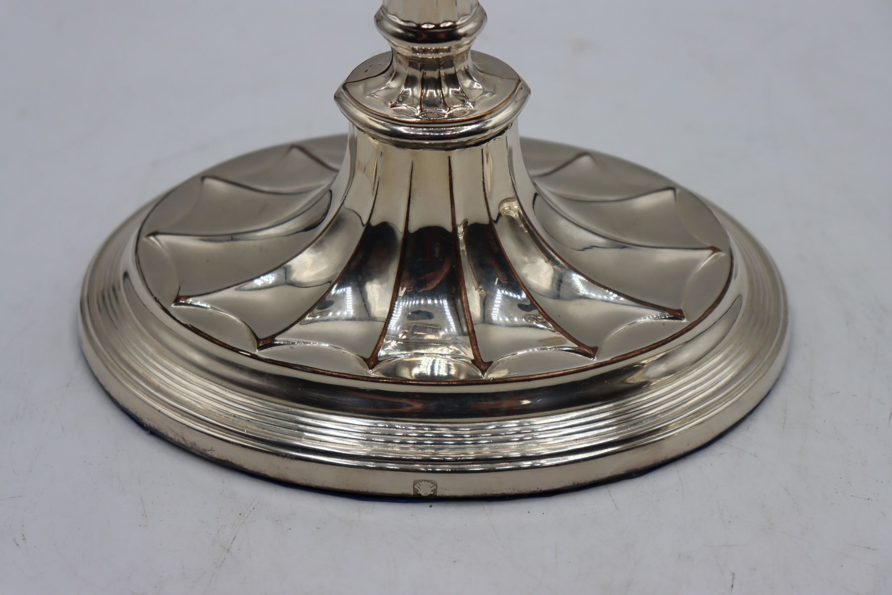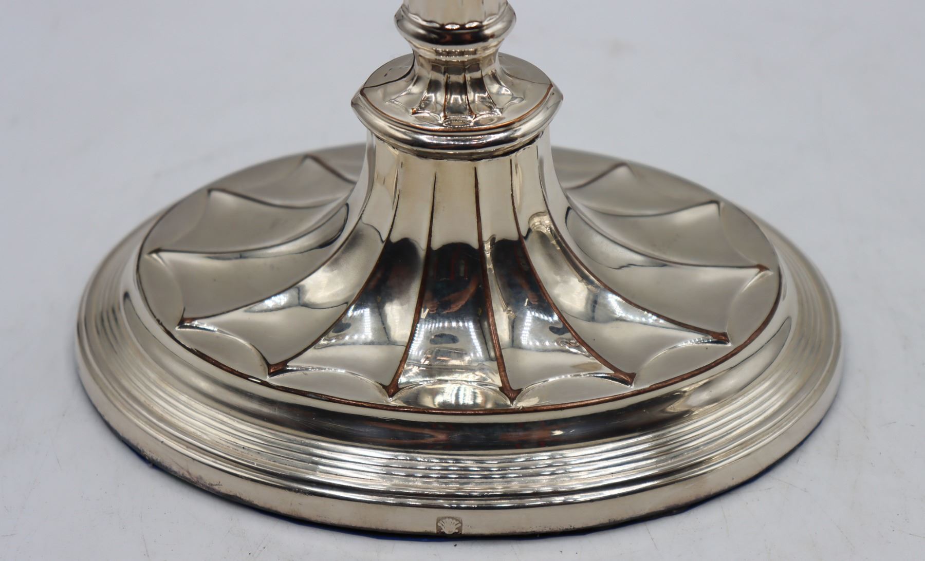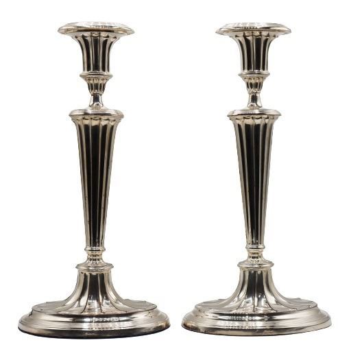 "England" on the rim. Pair of silver plate candlesticks. Size: 12 x 6 x 4 1/4 in.