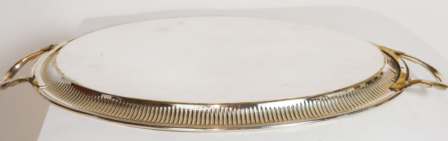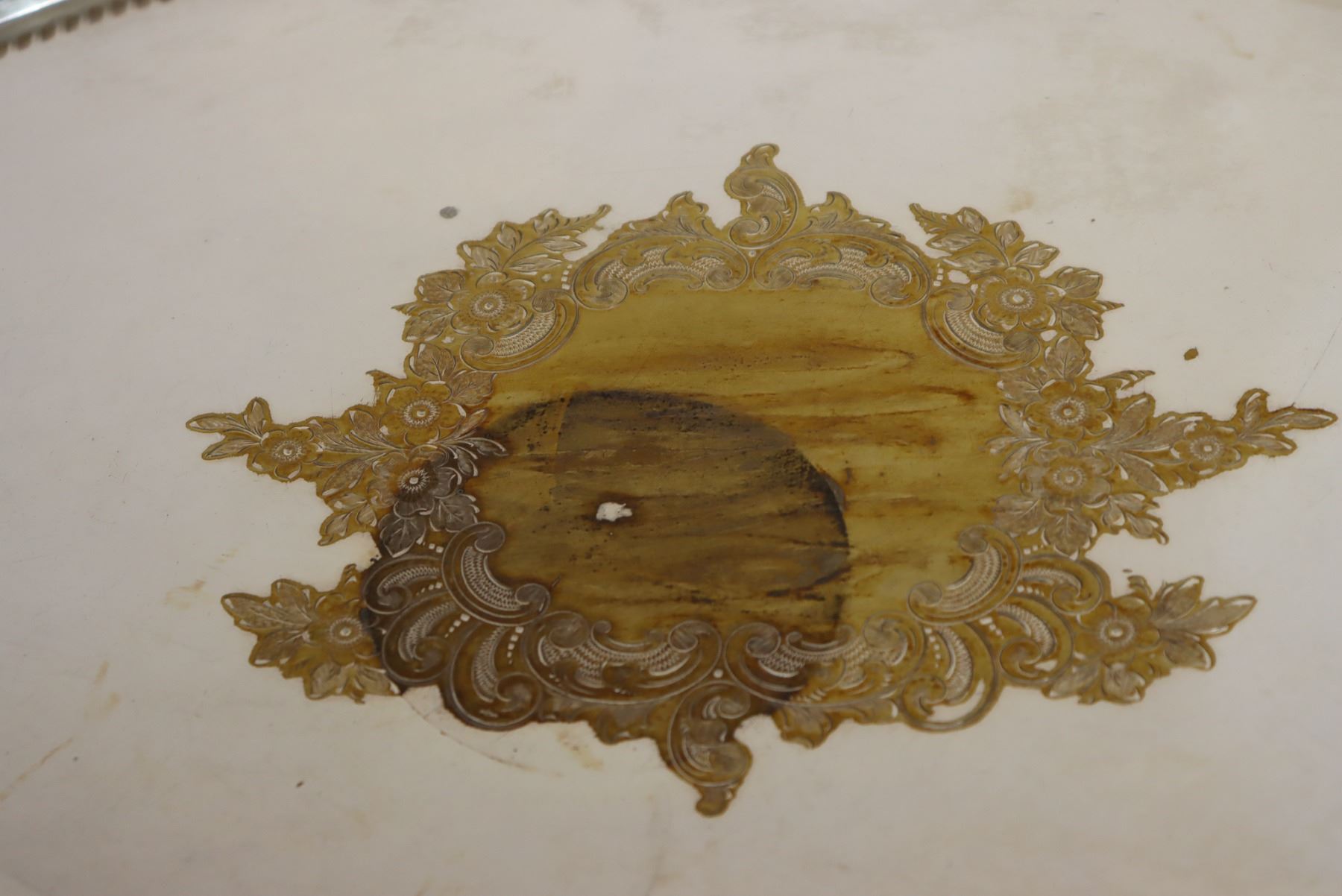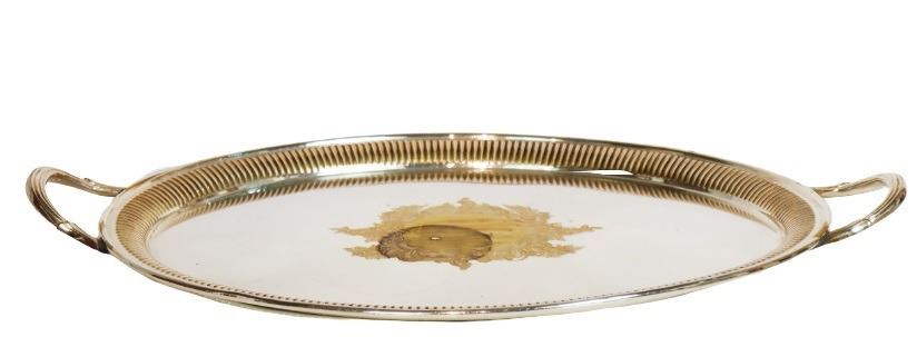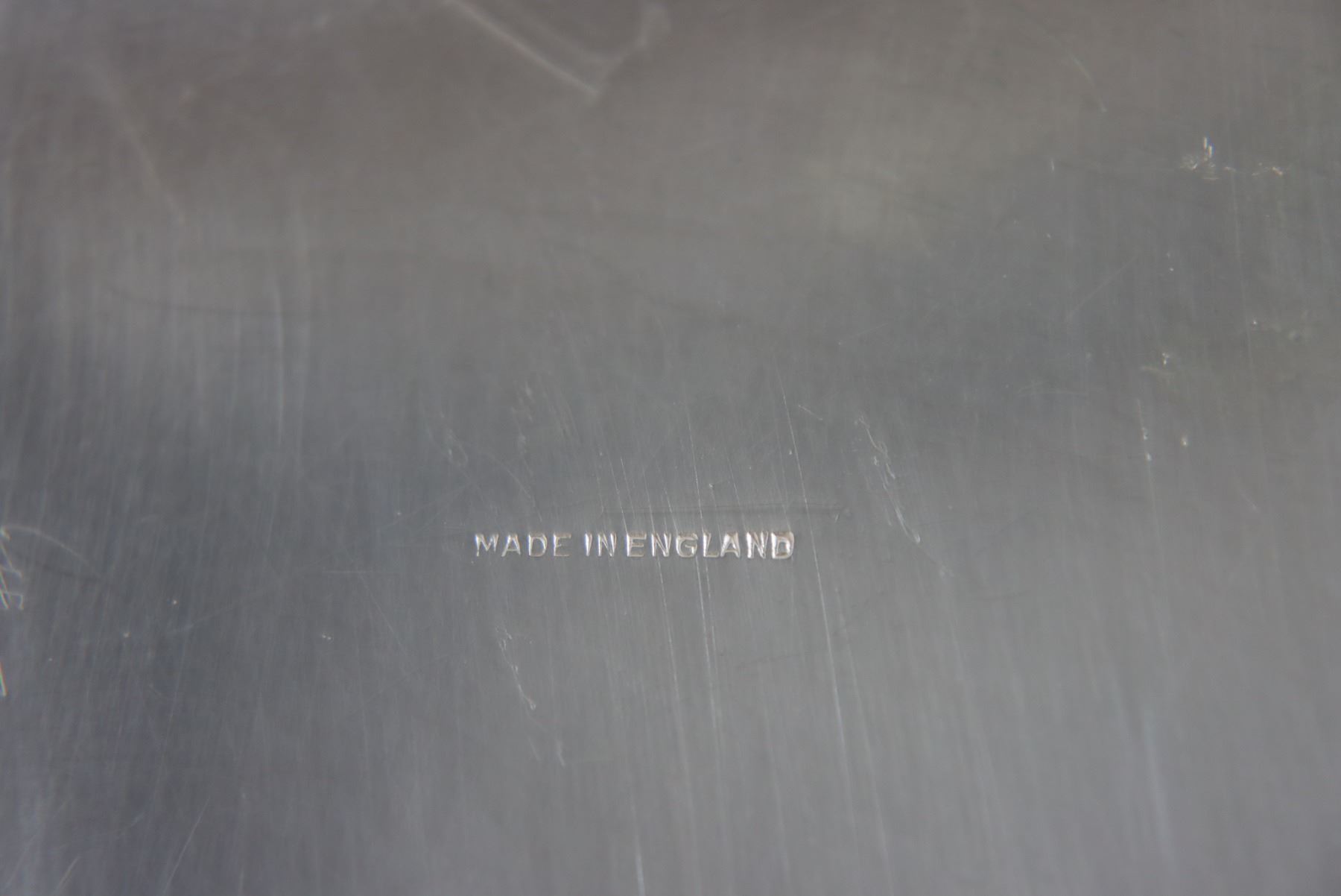 Floral design in the center of this silver plated tray. "Made in England" on the underside. As is. The size is 26 x 16 1/2 in.