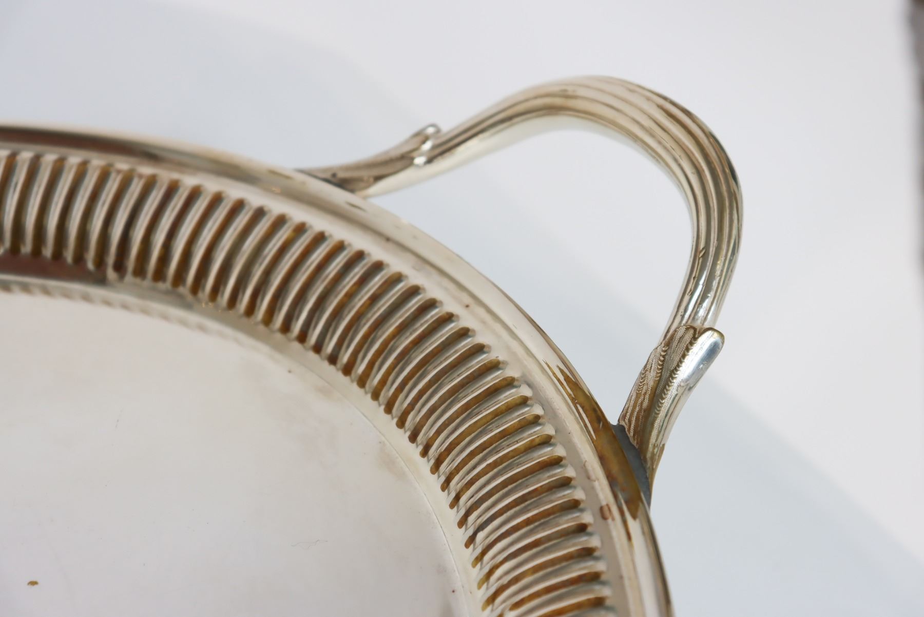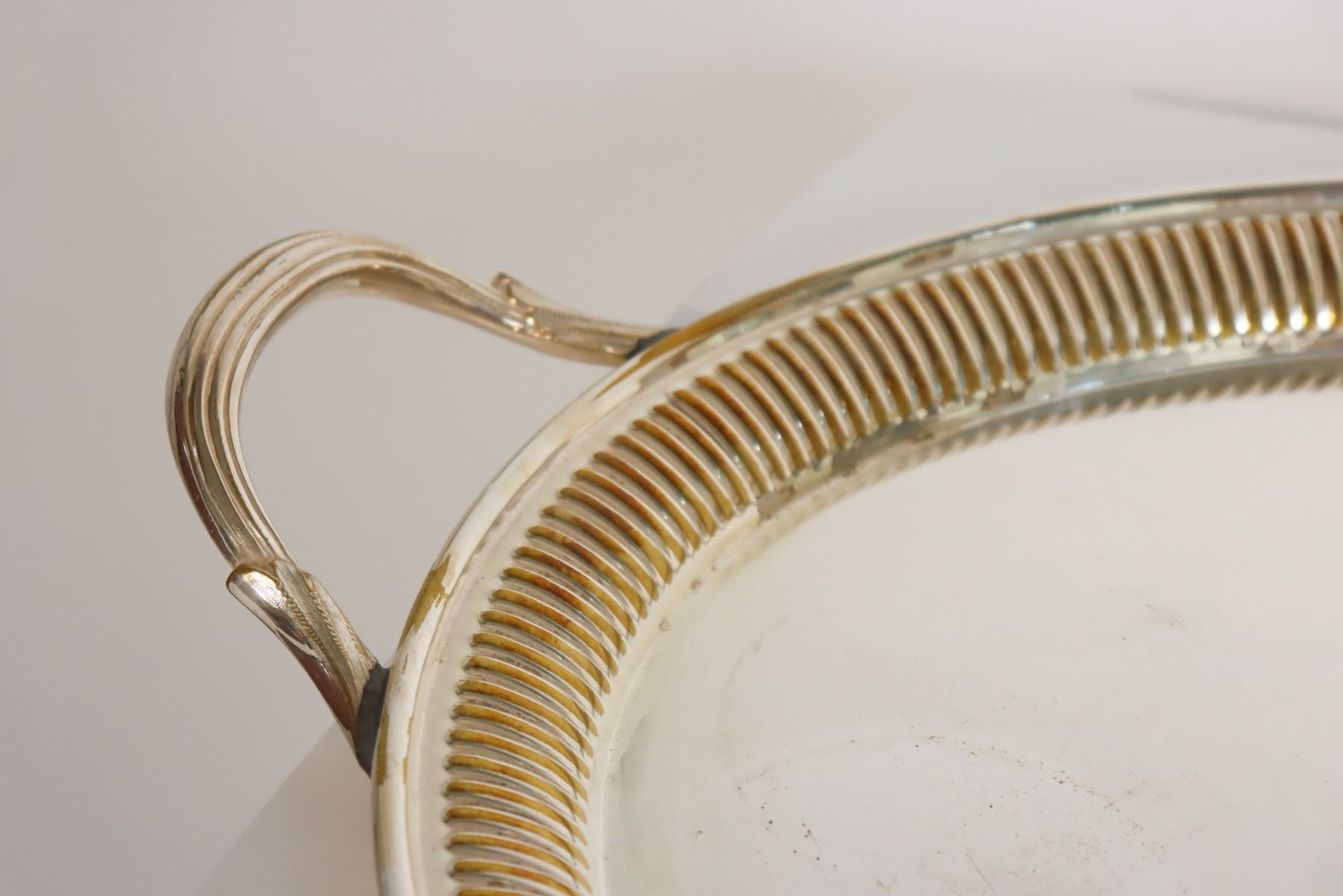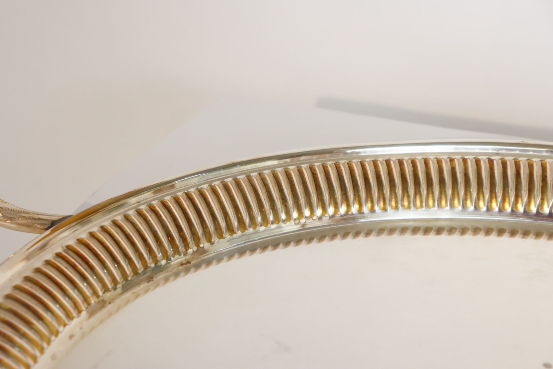Floral design in the center of this silver plated tray. "Made in England" on the underside. As is. The size is 26 x 16 1/2 in.